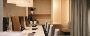 L’espace s’organise autour d’un geste clair et épuré : à l’arrivée, un comptoir d’accueil central accueille les visiteurs et établit un point focal évident.