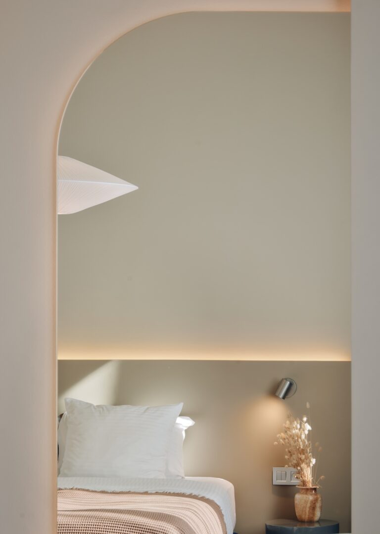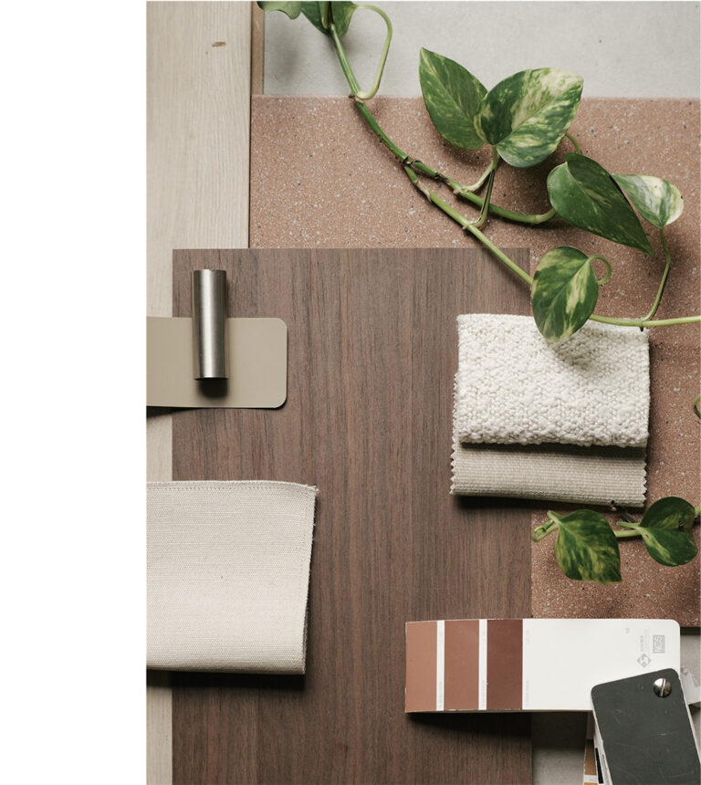 The material palette was conceived as a natural and timeless composition of tones for the rooms, complemented by color accents in the bathrooms.