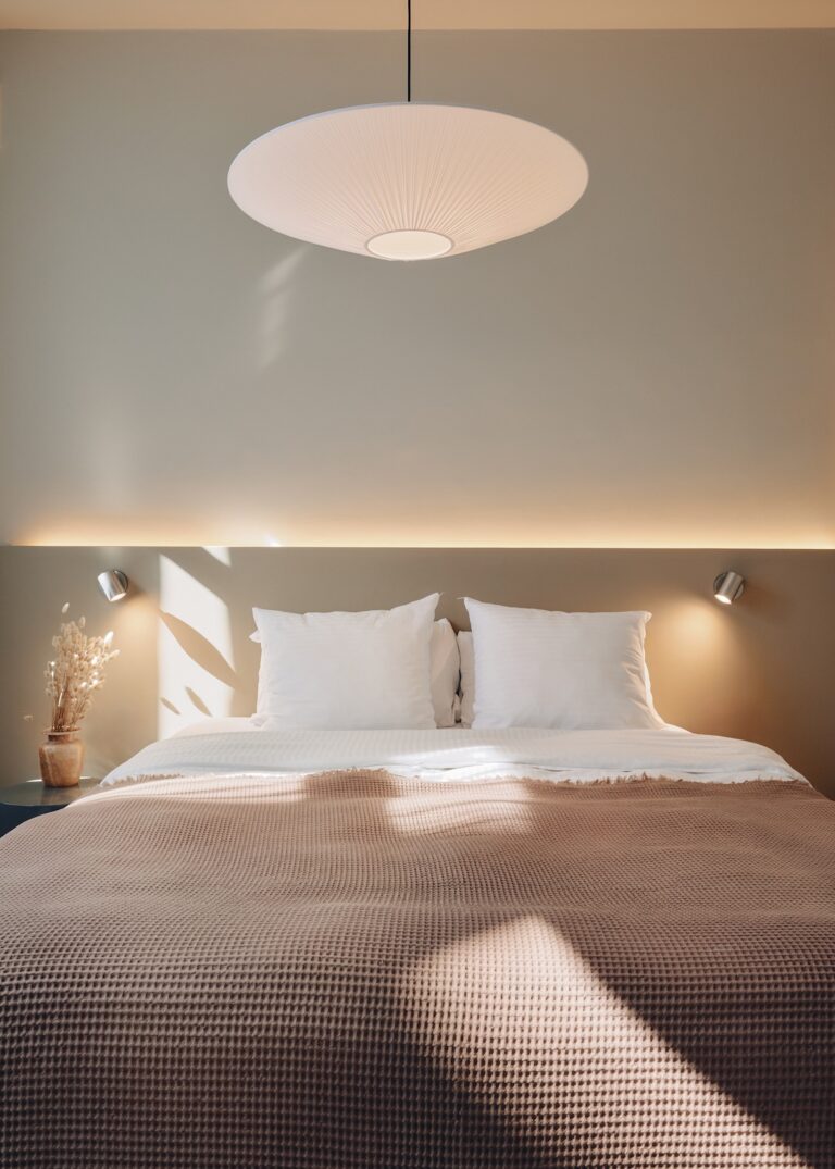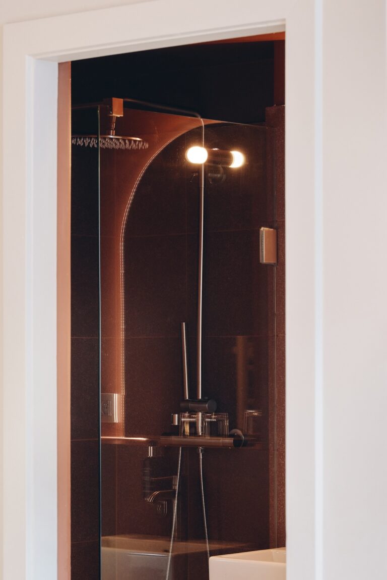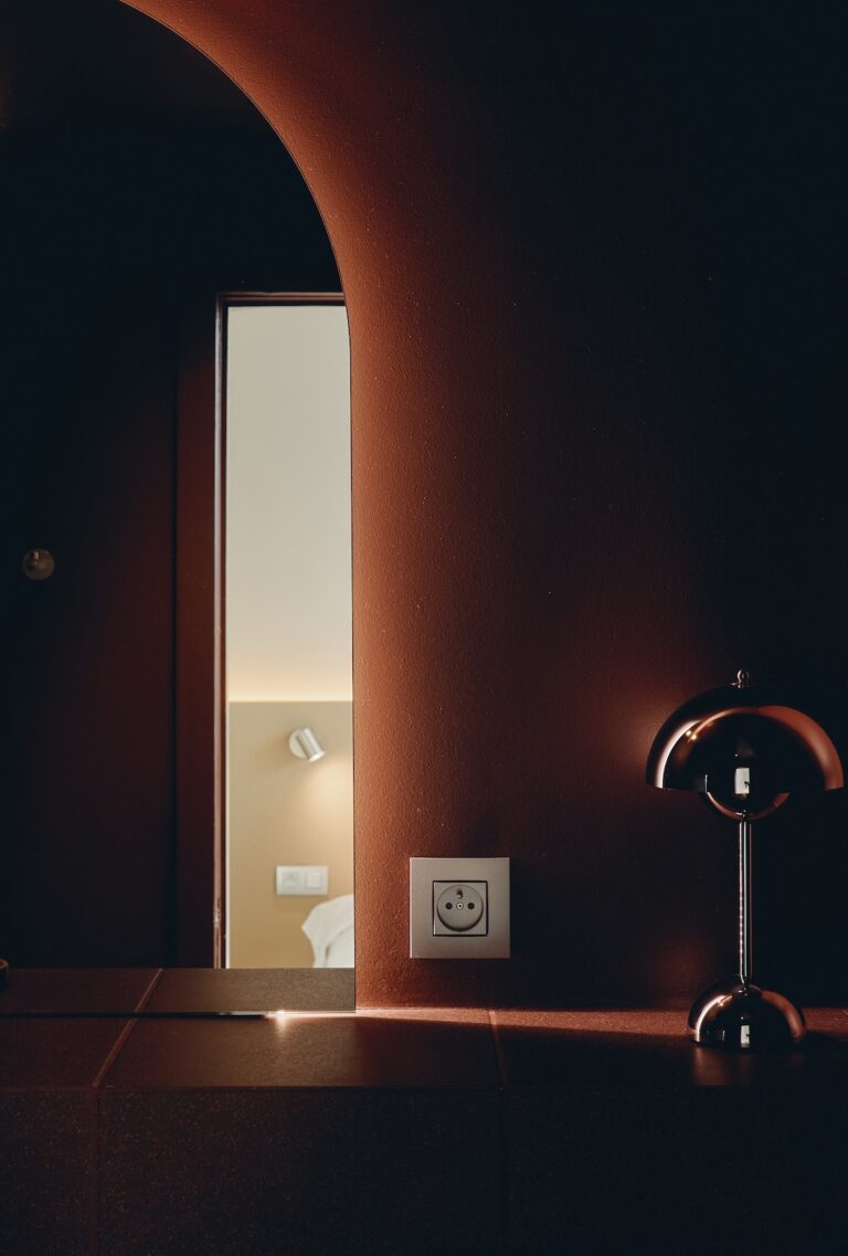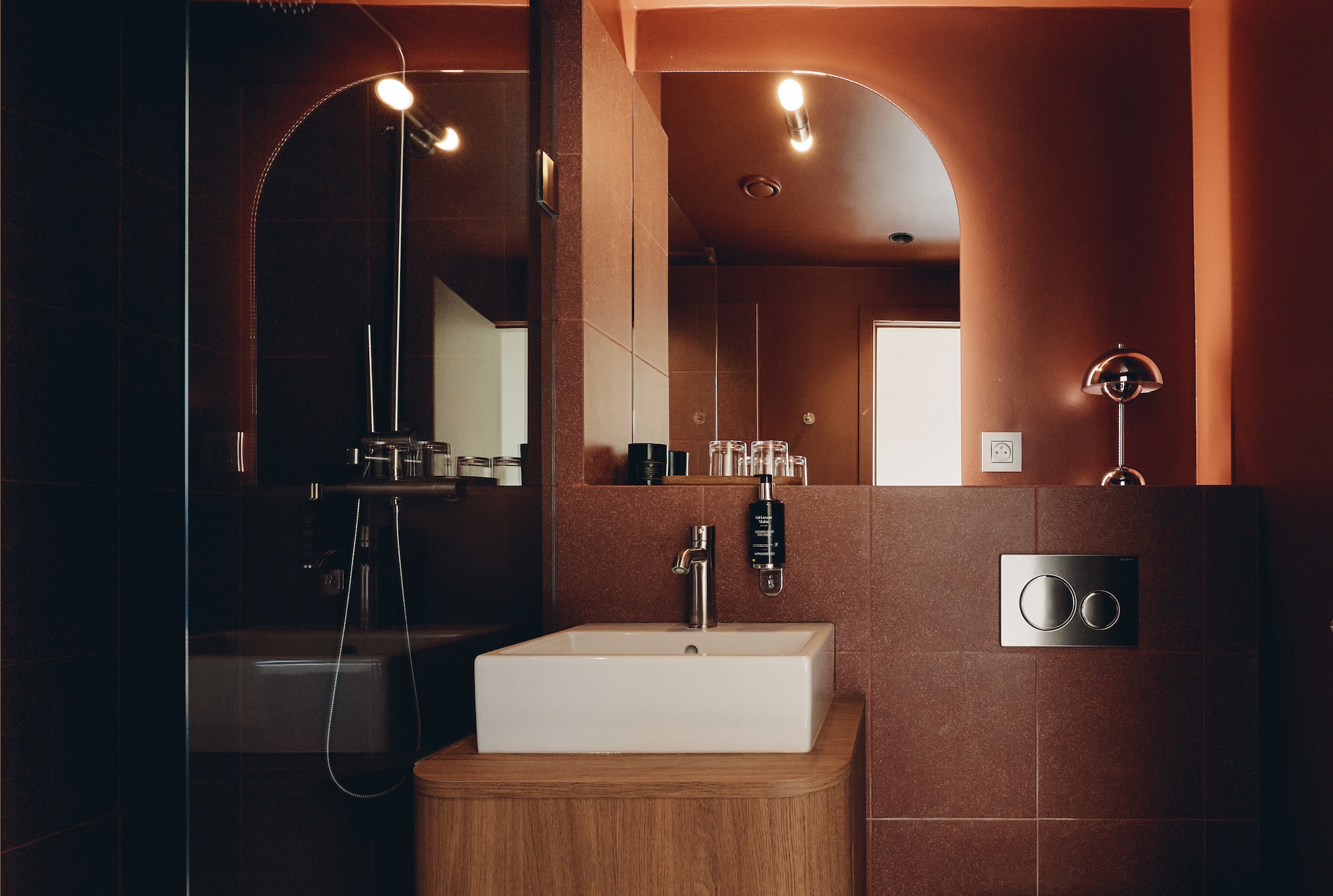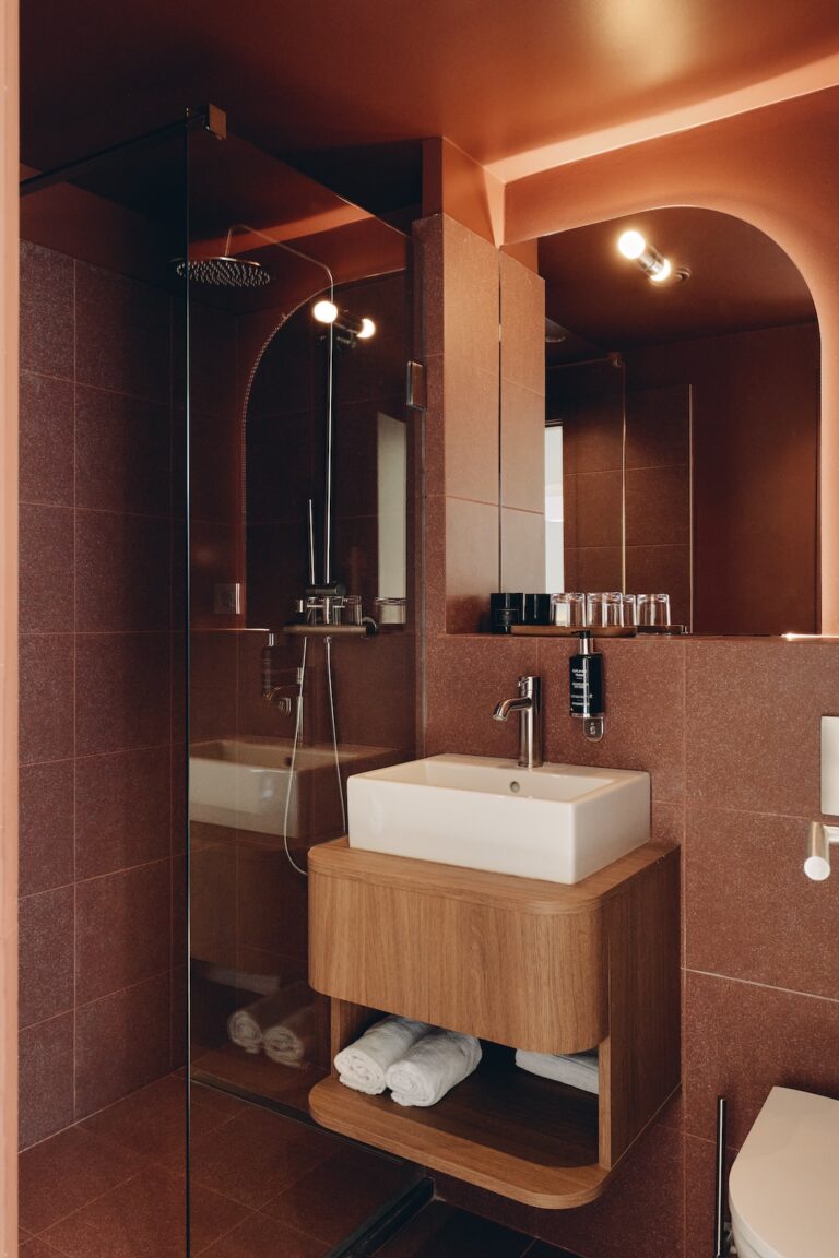 Warmth and intimacy are instilled through wooden flooring, metal accents, earthy textiles, and ambient lighting, all contributing to a homelike atmosphere for guests. In contrast, the bathrooms feature deep, saturated hues, designed to create an enveloping and sensorial experience.