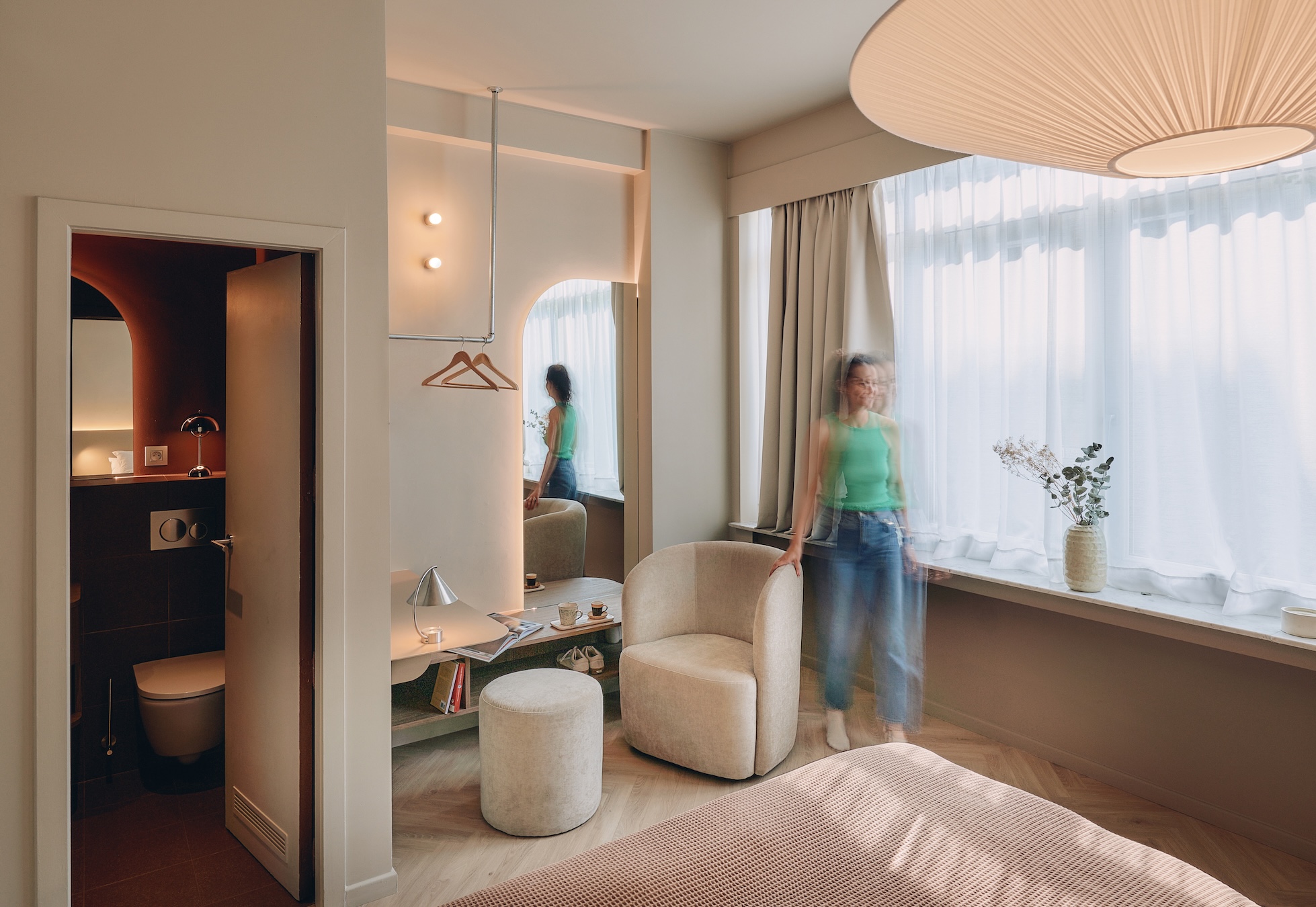 The mission extends to a full renovation of the 43 rooms, along with the ground-floor common areas including the lounge, reception, and cafeteria. Beginning with a test room now ready to experience, the works are set to be completed next year.
