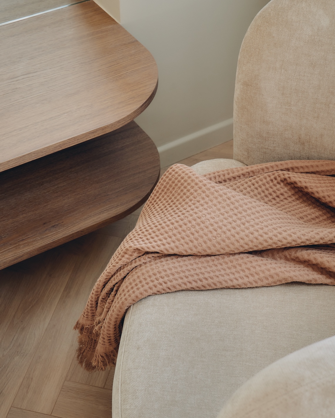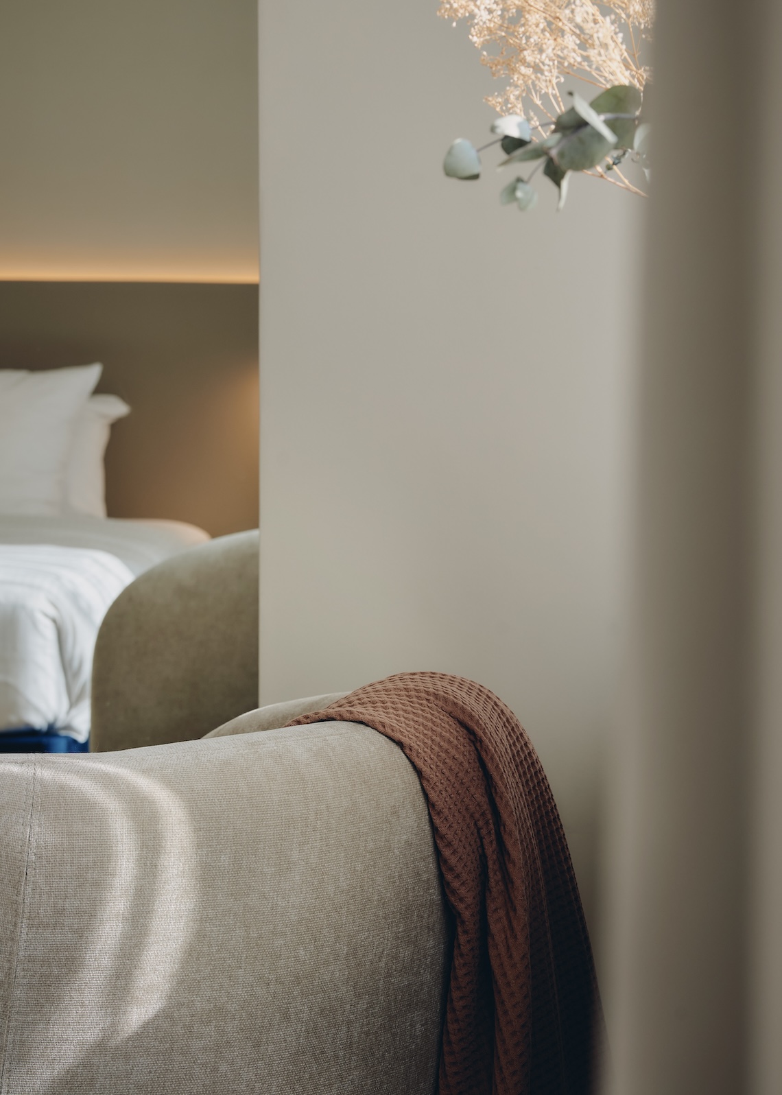 The material palette was conceived as a natural and timeless composition of tones for the rooms, complemented by color accents in the bathrooms.
