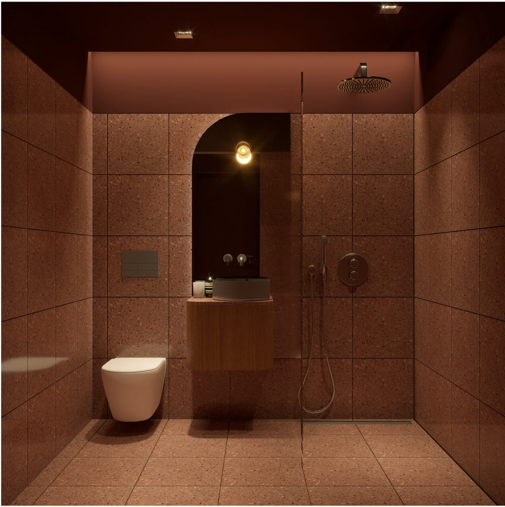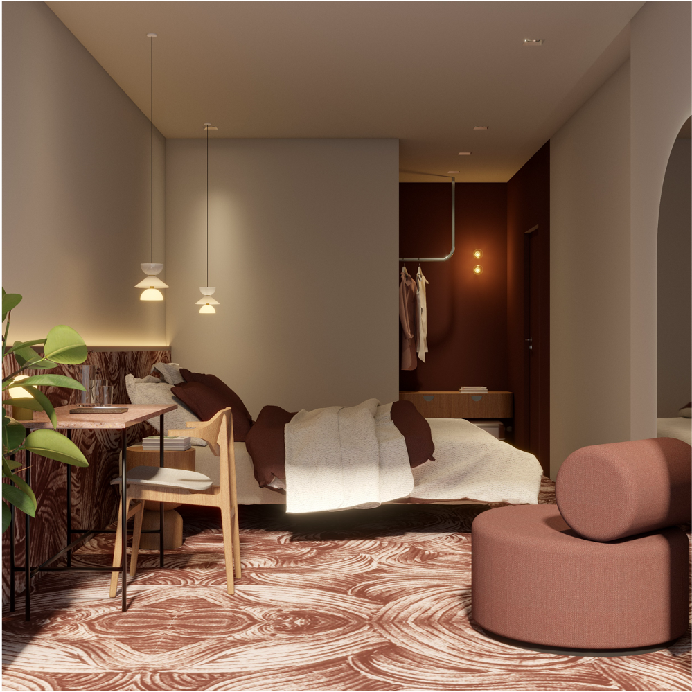Warmth and intimacy are instilled through wooden flooring, metal accents, earthy textiles, and ambient lighting, all contributing to a homelike atmosphere for guests. In contrast, the bathrooms feature deep, saturated hues, designed to create an enveloping and sensorial experience.