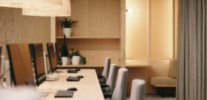 Central high table with wooden stools under a sculptural ring light, set against a backdrop of wood paneling and a digital screen.