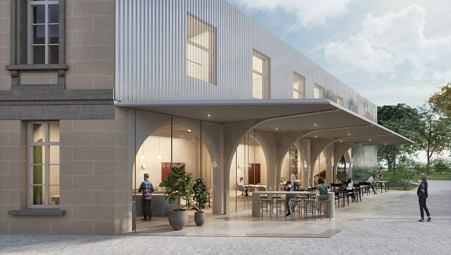 To enrich the building’s function, the program has been thoughtfully updated to include a coworking space and a cafeteria on the ground floor, extending onto a sheltered outdoor terrace.