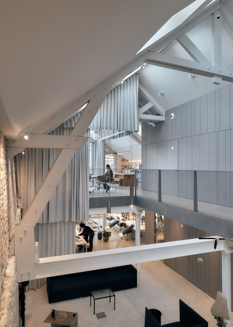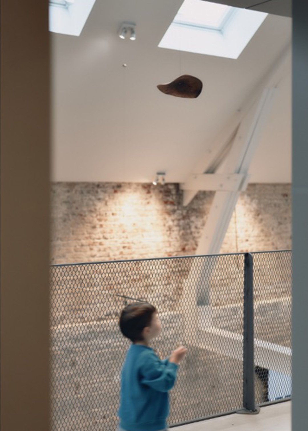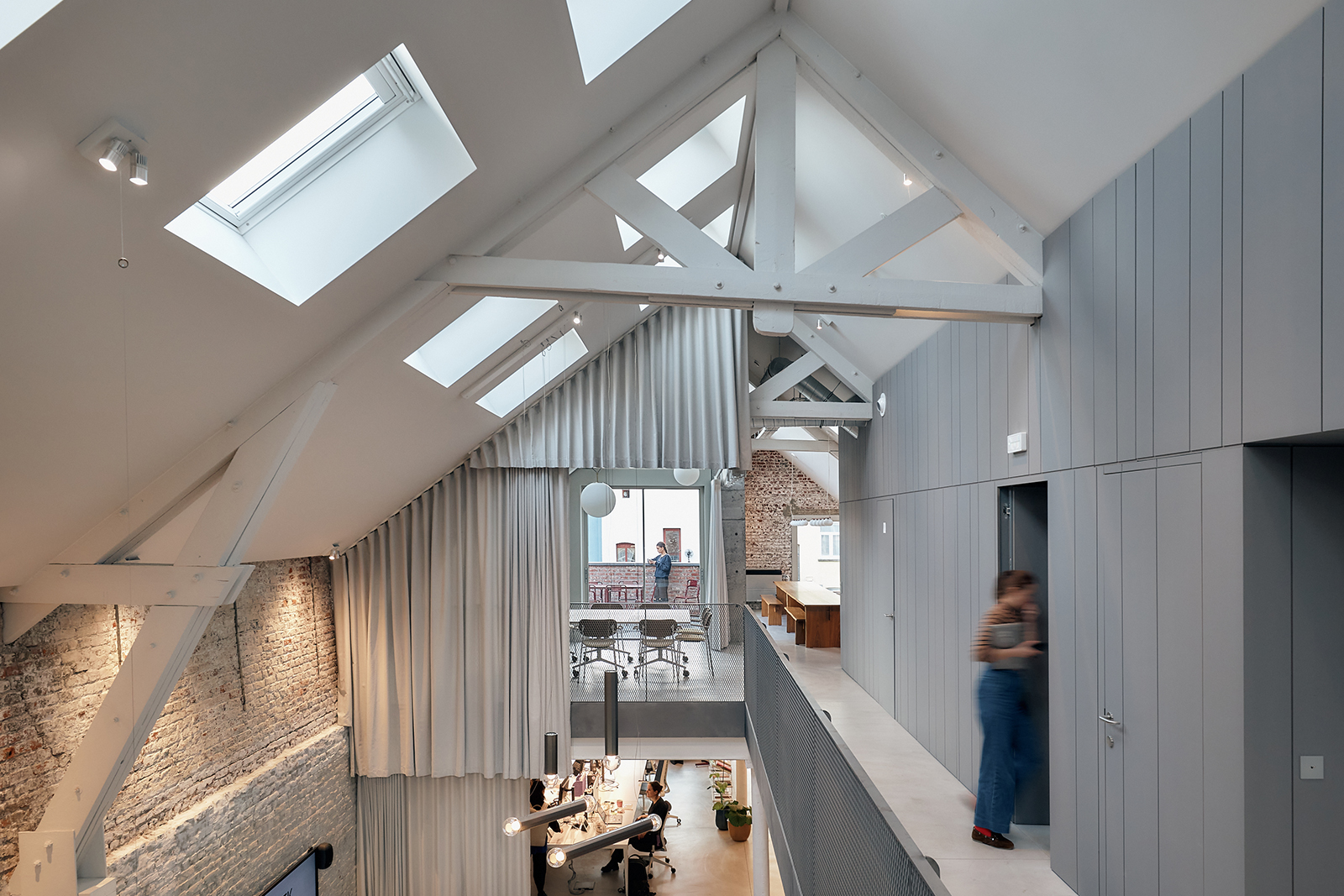 The renovation celebrates the building’s industrial character while introducing contemporary spatial dynamics. Structural interventions including a complete roof replacement and partial floor demolition bring natural light deep into the building and create fluid connections while original surfaces, exposed junctions and visible imperfections are preserved in a spirit of architectural honesty.