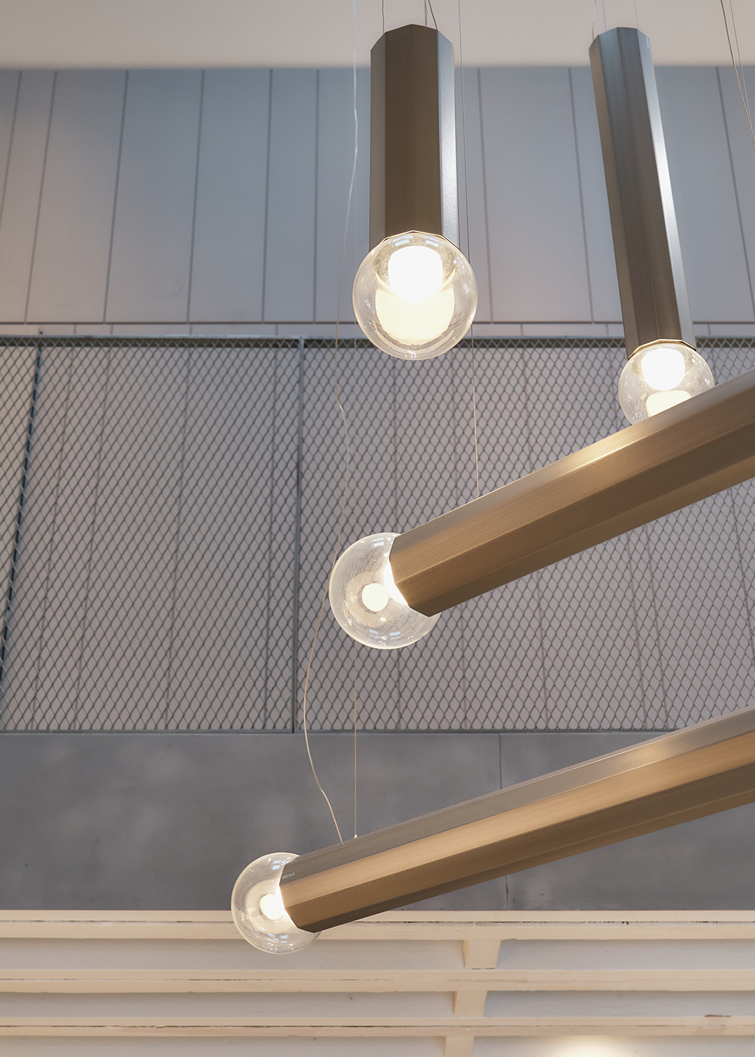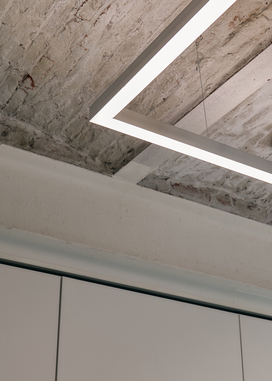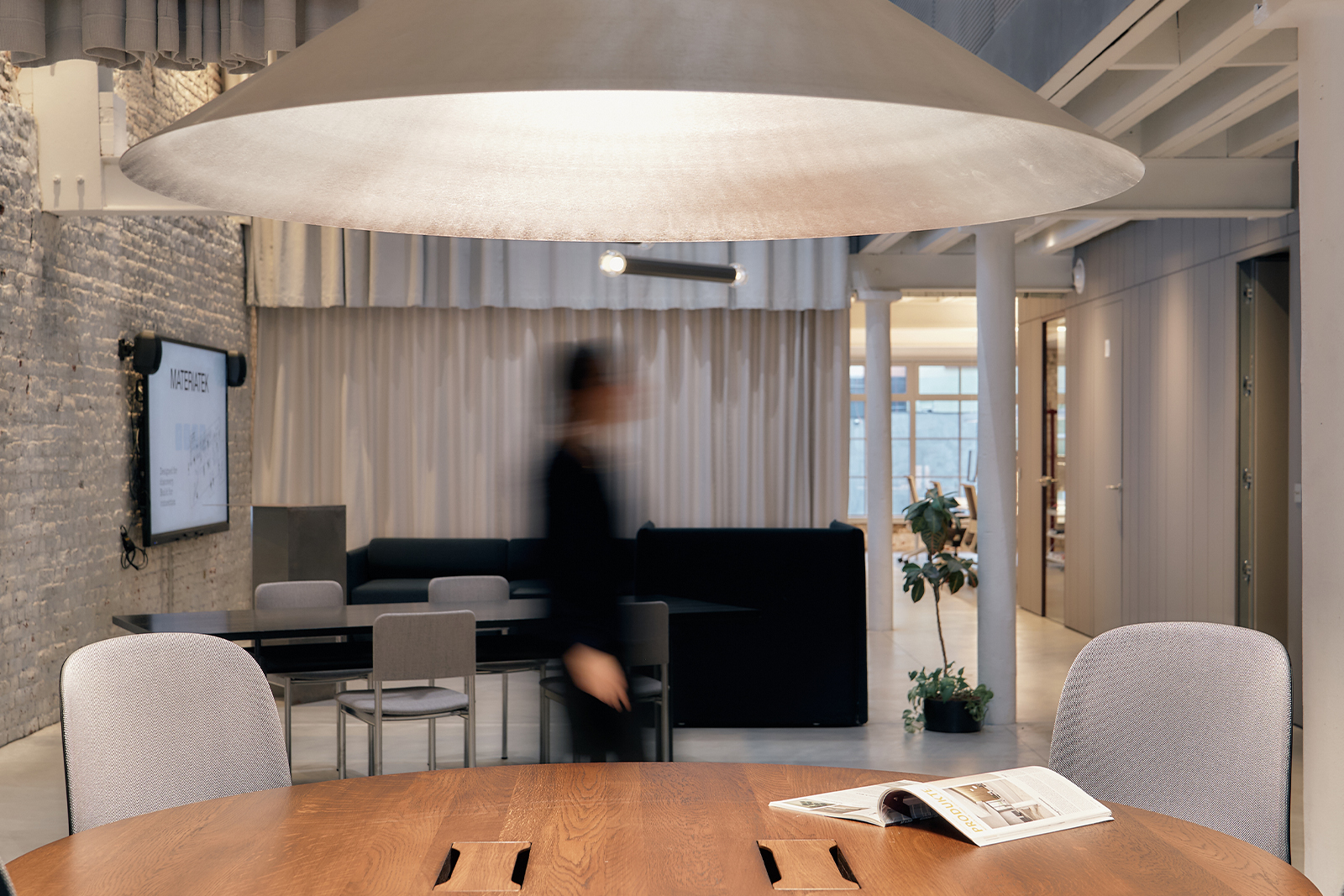 Lighting was approached with equal care: decorative fixtures blend with advanced technical setups for worktops and dedicated material-consulting areas, while natural light moves through a deliberately porous layout that encourages movement, visibility and spontaneous encounters.
