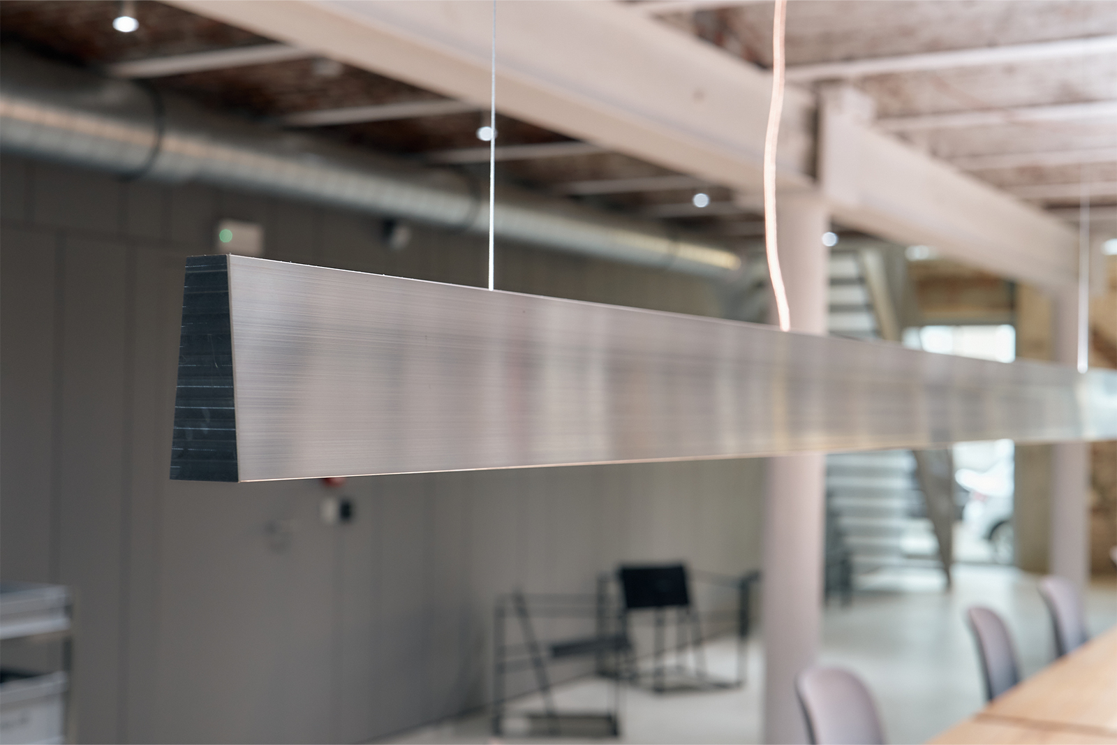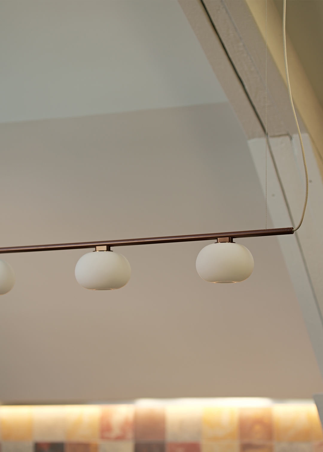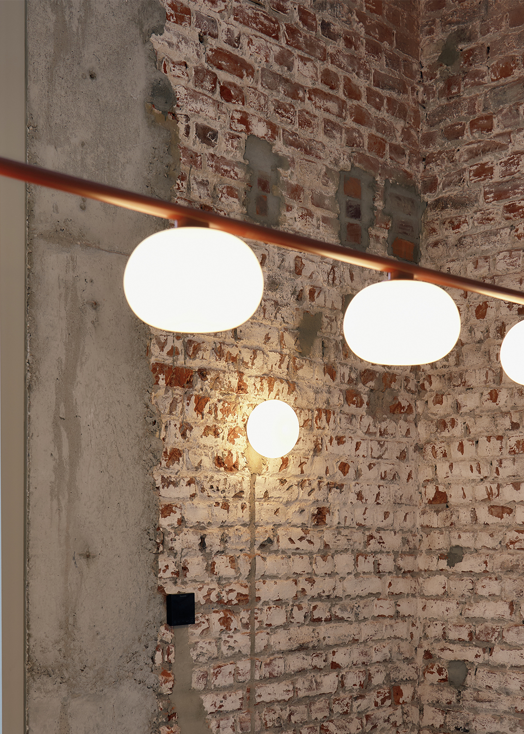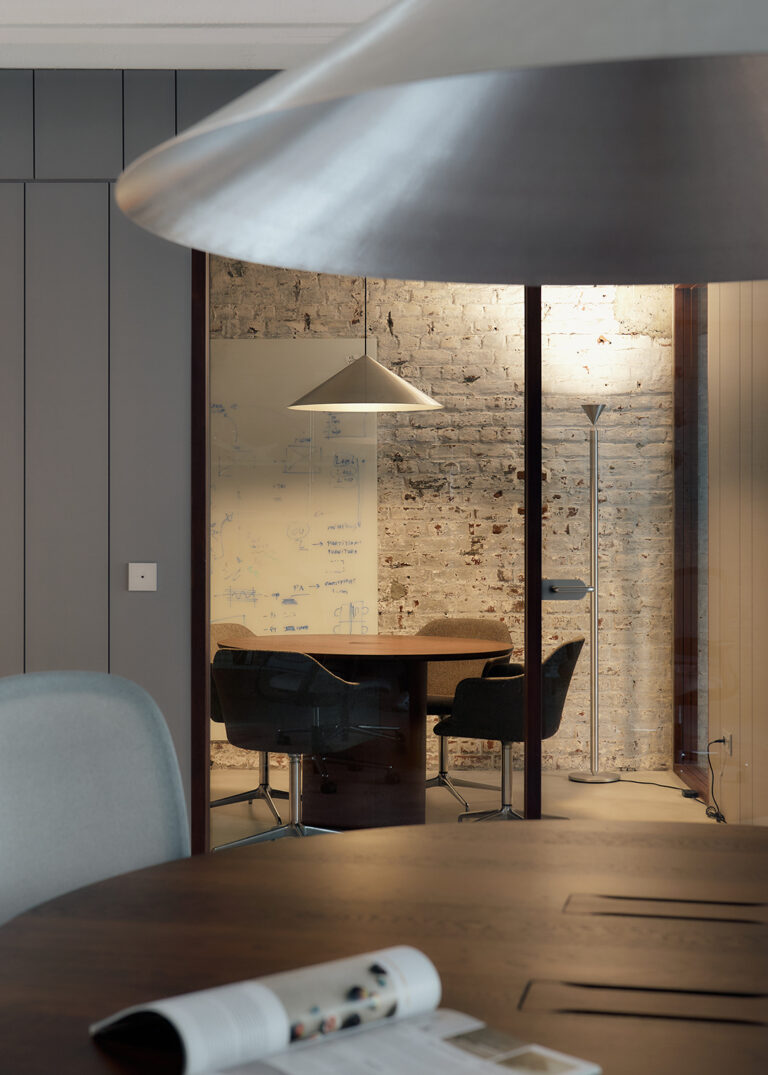 Lighting was approached with equal care: decorative fixtures blend with advanced technical setups for worktops and dedicated material-consulting areas, while natural light moves through a deliberately porous layout that encourages movement, visibility and spontaneous encounters.