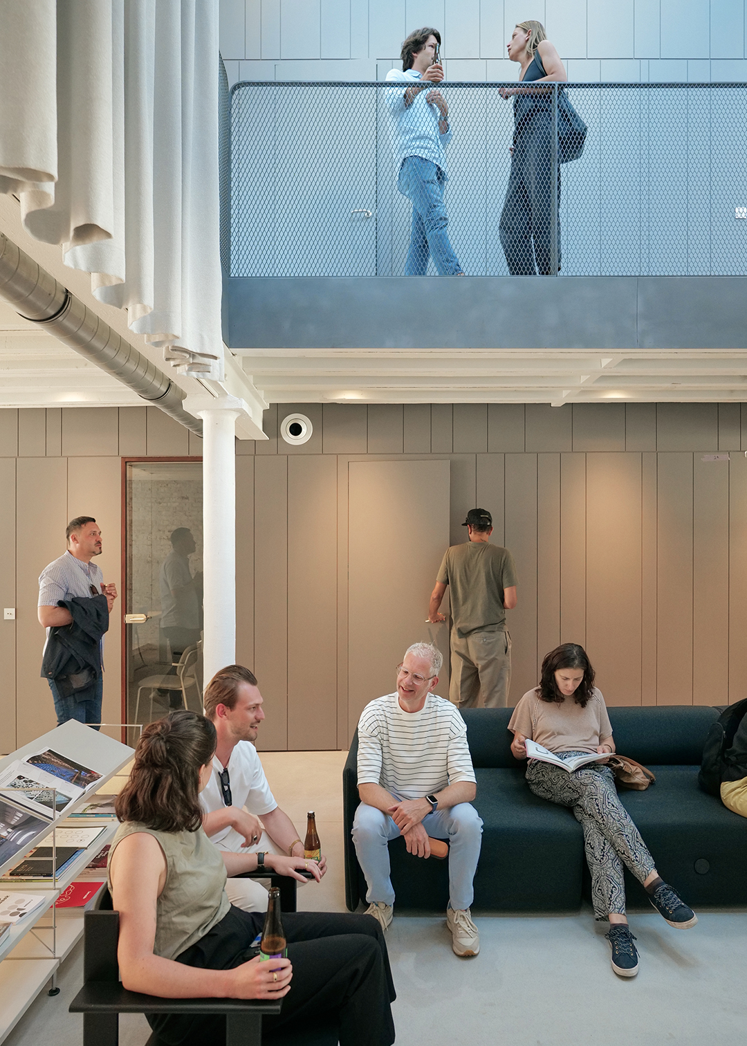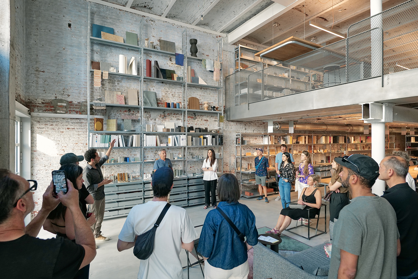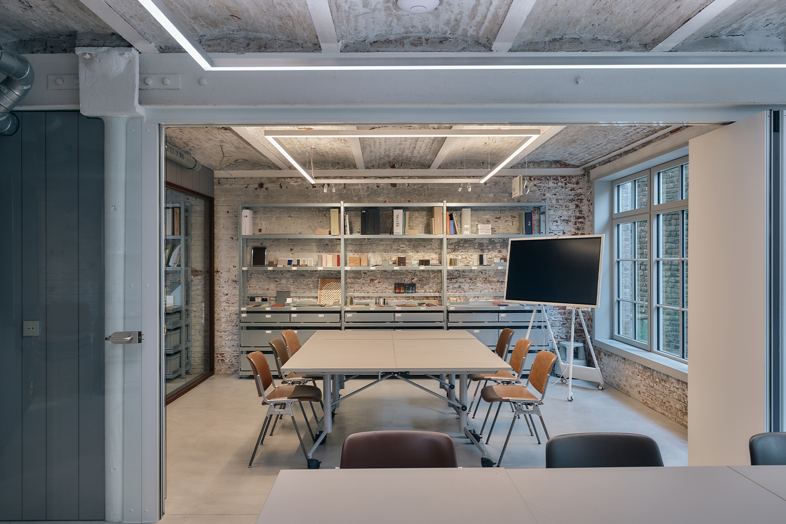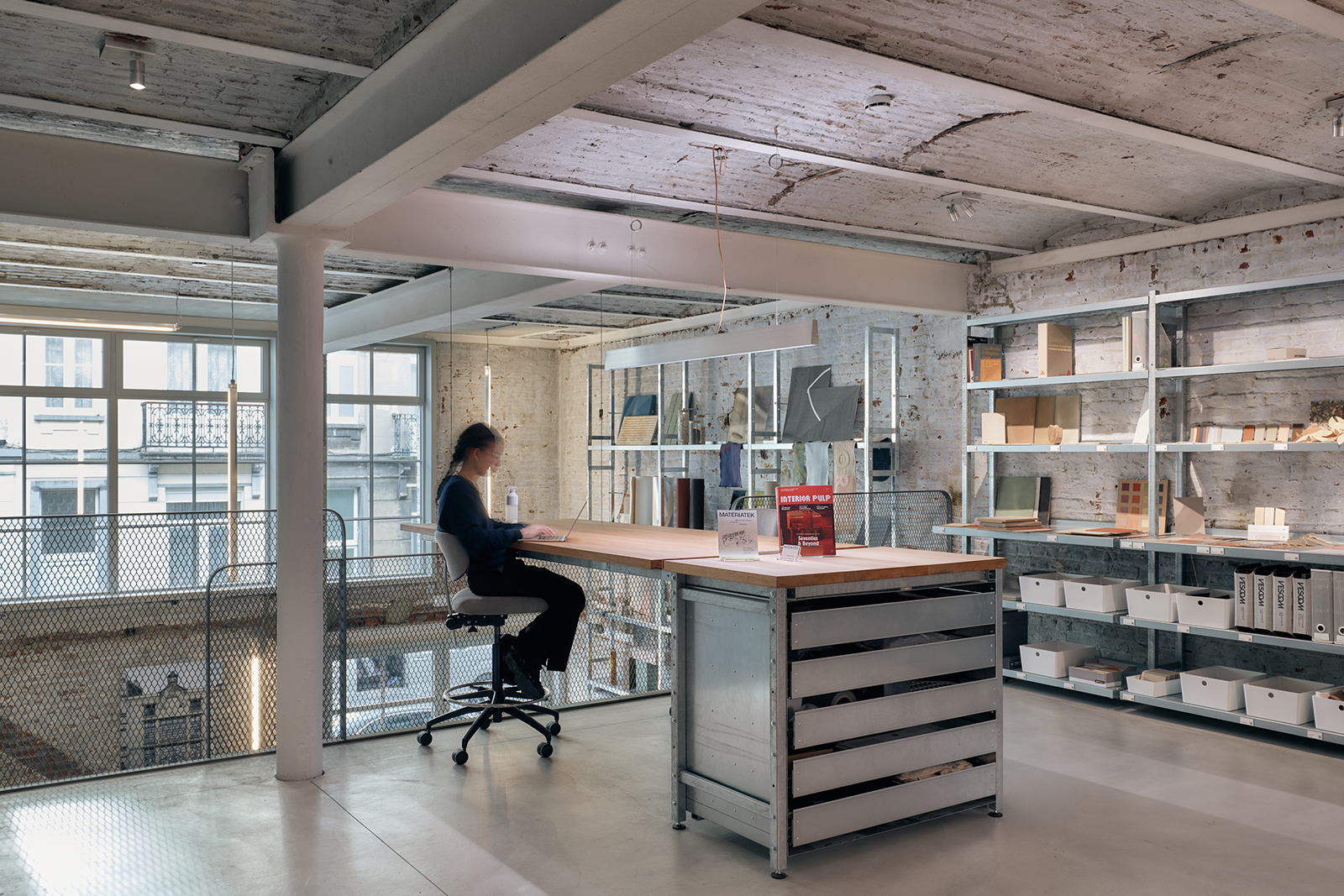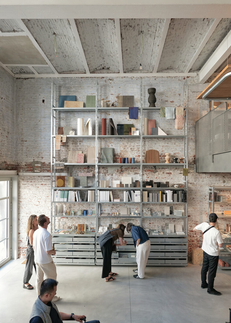 Across the building, each pair of floors takes on a distinct role. The ground and first levels host a material library and coworking area, where full-height galvanised steel shelving lines the raw brick walls, paired with long communal tables for collaboration and material checks, as well as fully equipped meeting rooms and individual booths. Above, the second and third floors revolve around the double-height “Set” a polyvalent central space that organises circulation and various workspace typologies, shifting easily from an informal daily lounge to configurations that support lectures, workshops or events. At the top, a generous kitchen opens onto a new terrace, complemented by flexible workspaces and support areas.