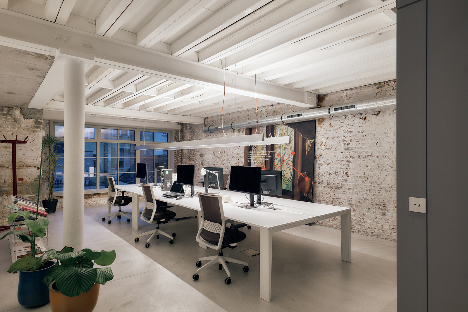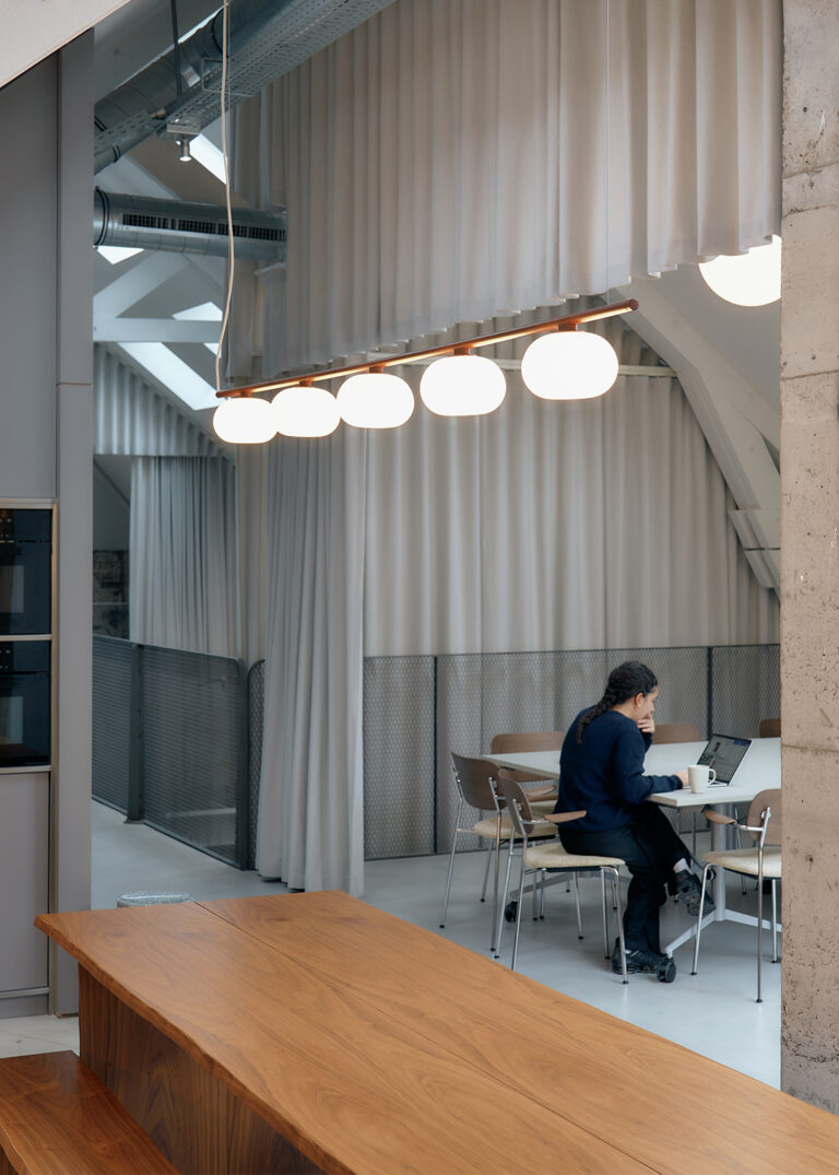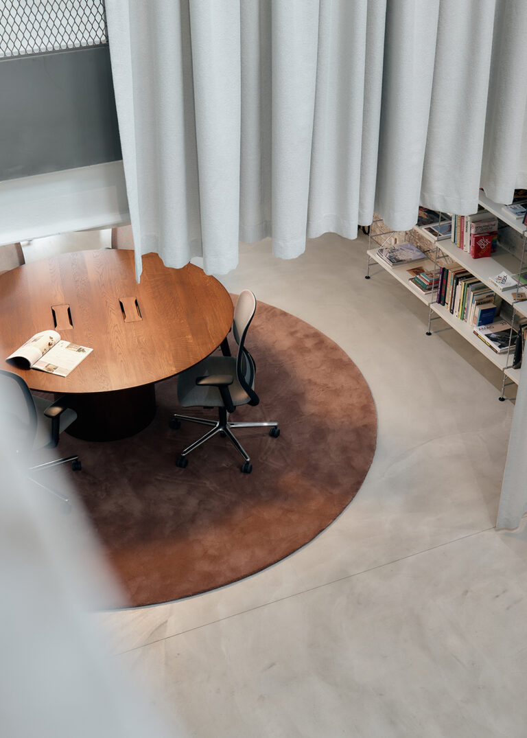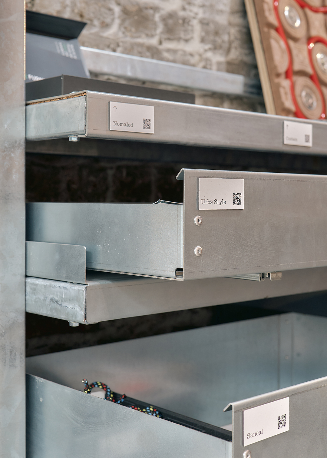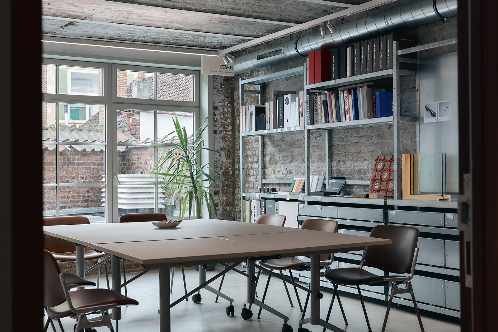 Across the building, each pair of floors takes on a distinct role. The ground and first levels host a material library and coworking area, where full-height galvanised steel shelving lines the raw brick walls, paired with long communal tables for collaboration and material checks, as well as fully equipped meeting rooms and individual booths. Above, the second and third floors revolve around the double-height “Set” a polyvalent central space that organises circulation and various workspace typologies, shifting easily from an informal daily lounge to configurations that support lectures, workshops or events. At the top, a generous kitchen opens onto a new terrace, complemented by flexible workspaces and support areas.