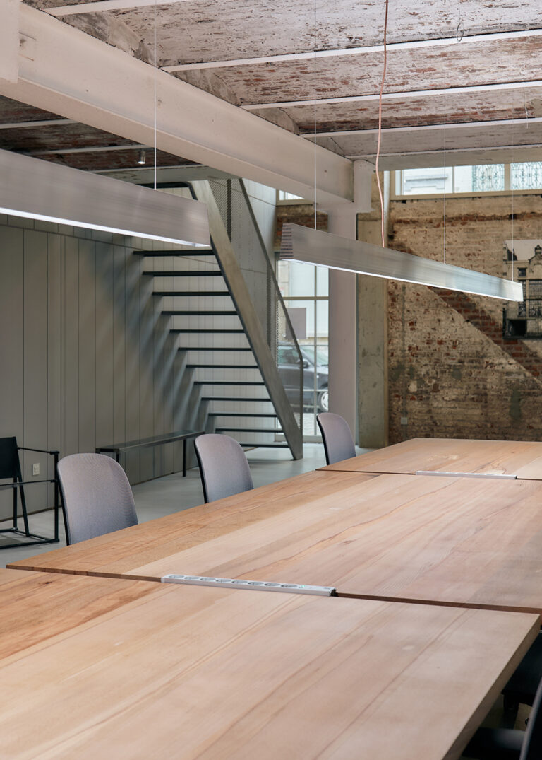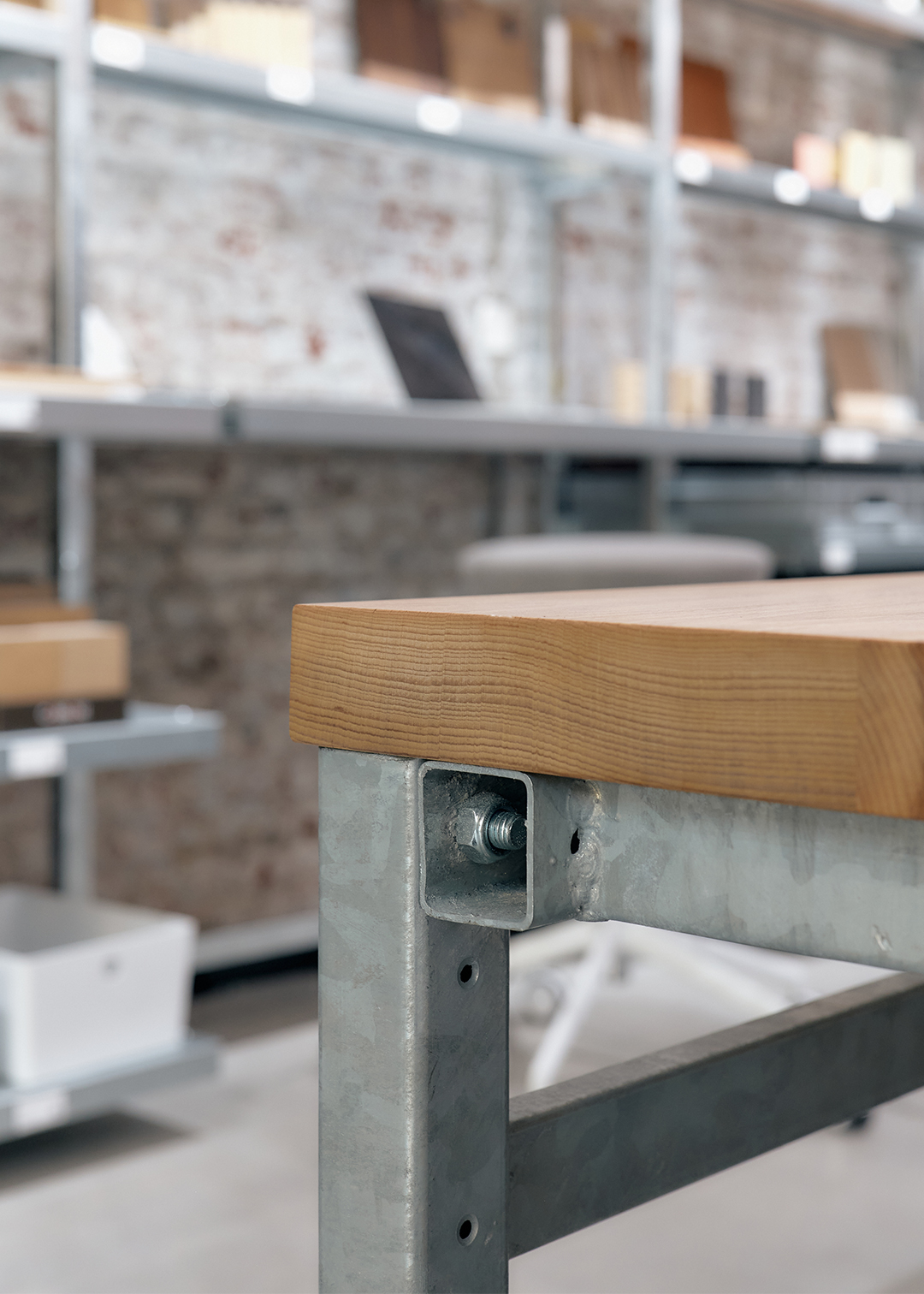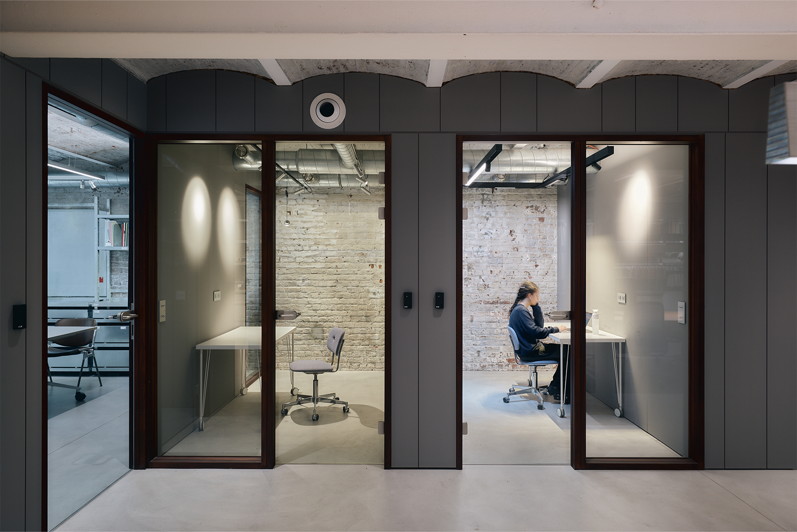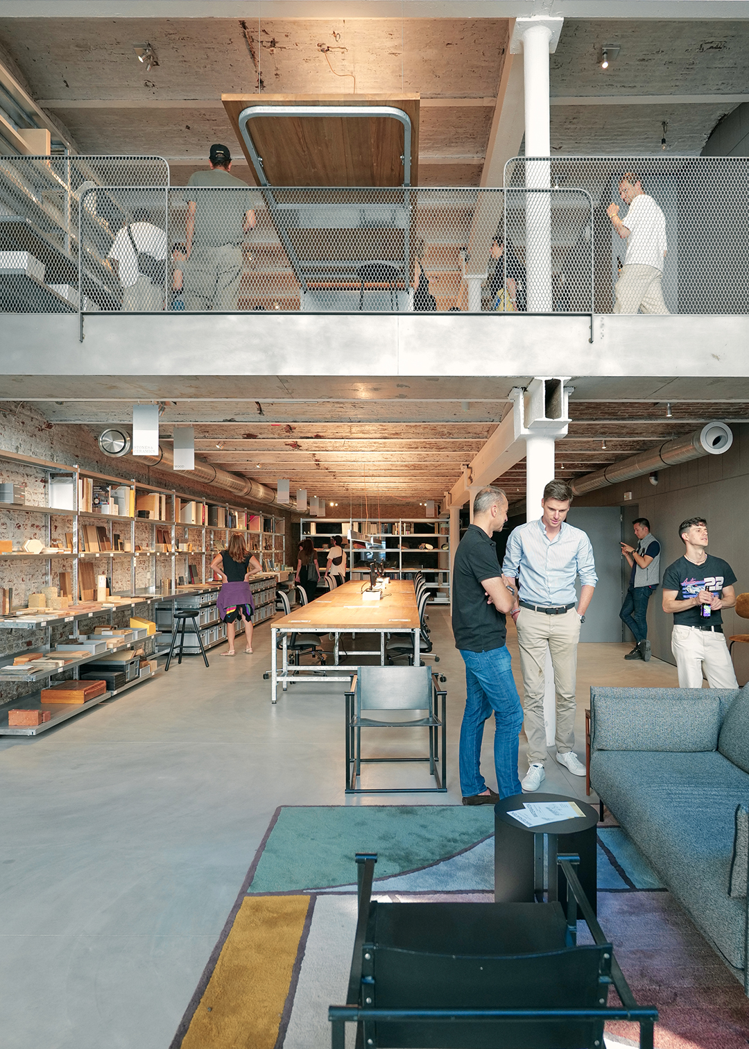 Across the building, each pair of floors takes on a distinct role. The ground and first levels host a material library and coworking area, where full-height galvanised steel shelving lines the raw brick walls, paired with long communal tables for collaboration and material checks, as well as fully equipped meeting rooms and individual booths. Above, the second and third floors revolve around the double-height “Set” a polyvalent central space that organises circulation and various workspace typologies, shifting easily from an informal daily lounge to configurations that support lectures, workshops or events. At the top, a generous kitchen opens onto a new terrace, complemented by flexible workspaces and support areas.