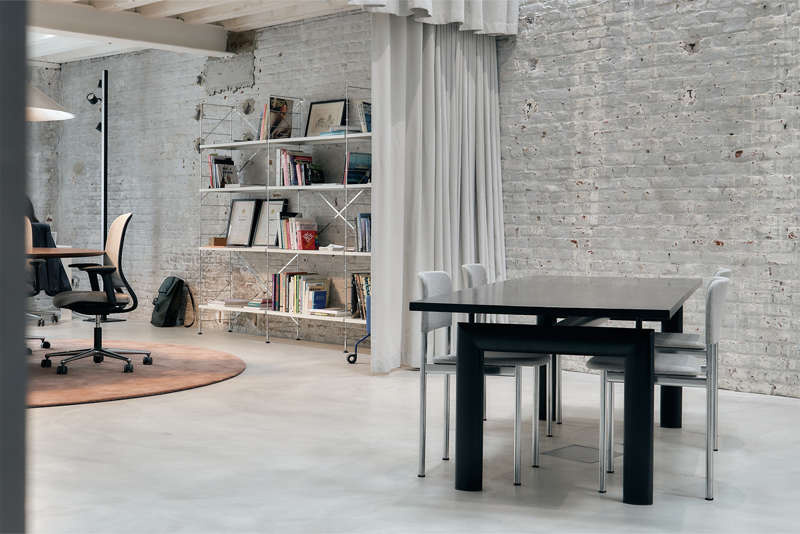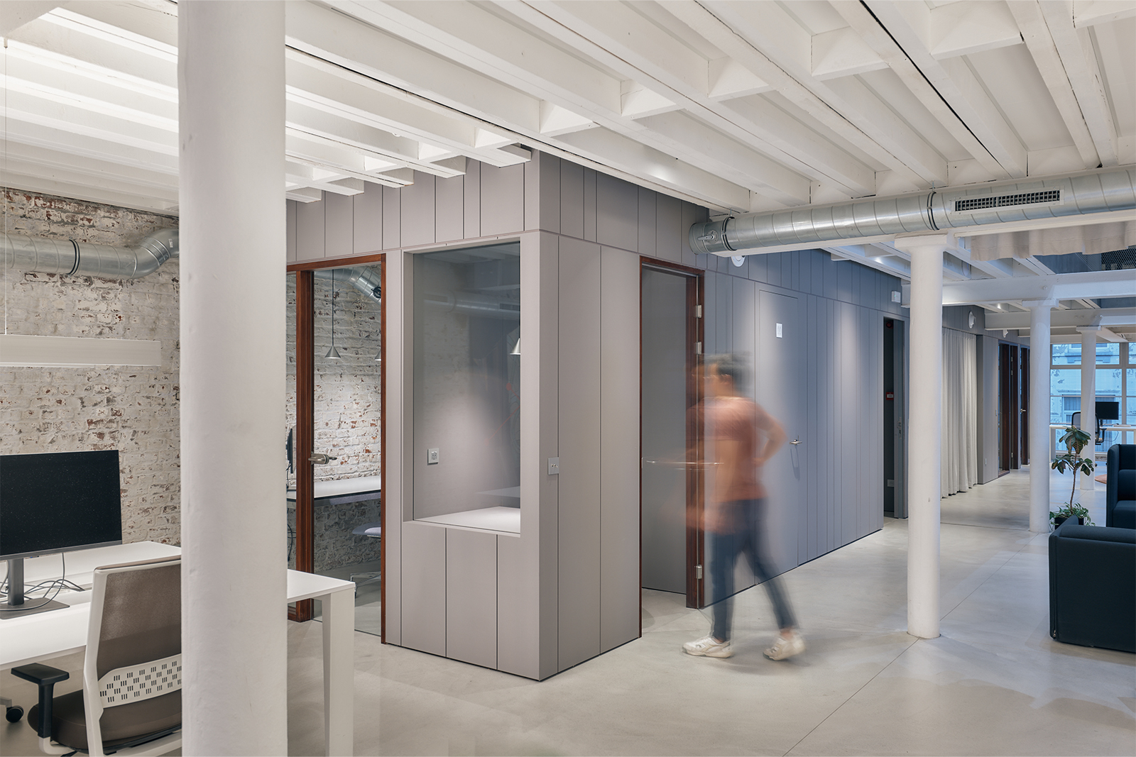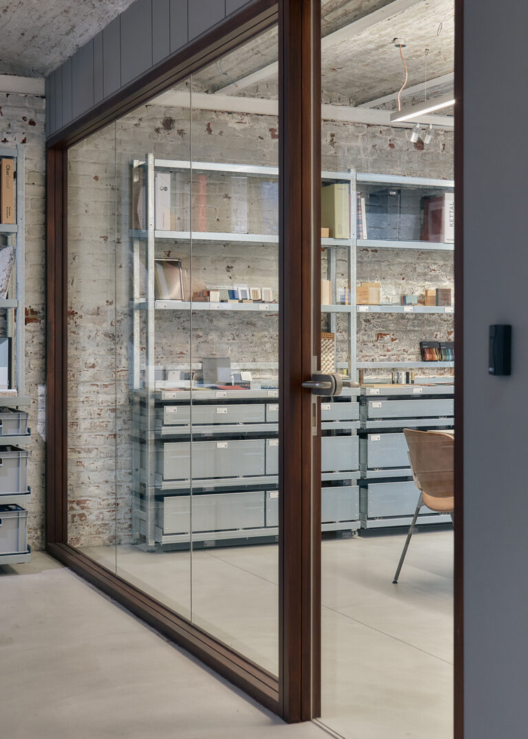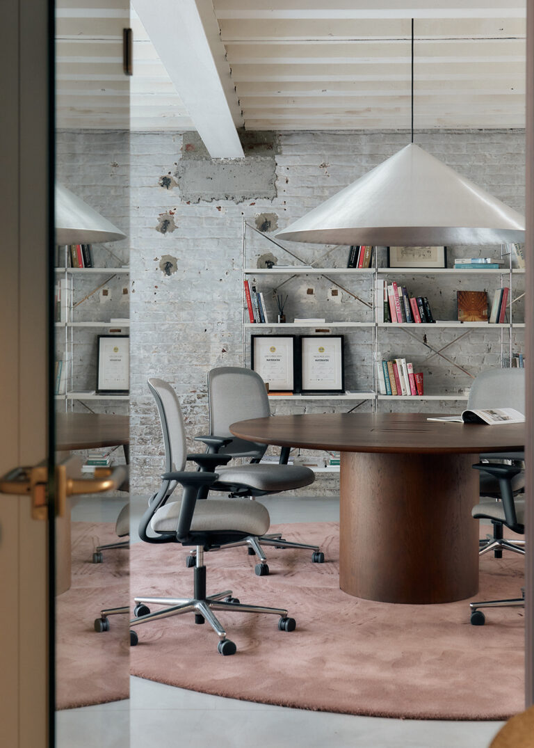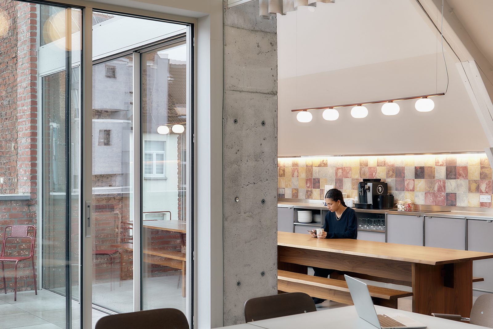 Across the building, each pair of floors takes on a distinct role. The ground and first levels host a material library and coworking area, where full-height galvanised steel shelving lines the raw brick walls, paired with long communal tables for collaboration and material checks, as well as fully equipped meeting rooms and individual booths. Above, the second and third floors revolve around the double-height “Set” a polyvalent central space that organises circulation and various workspace typologies, shifting easily from an informal daily lounge to configurations that support lectures, workshops or events. At the top, a generous kitchen opens onto a new terrace, complemented by flexible workspaces and support areas.