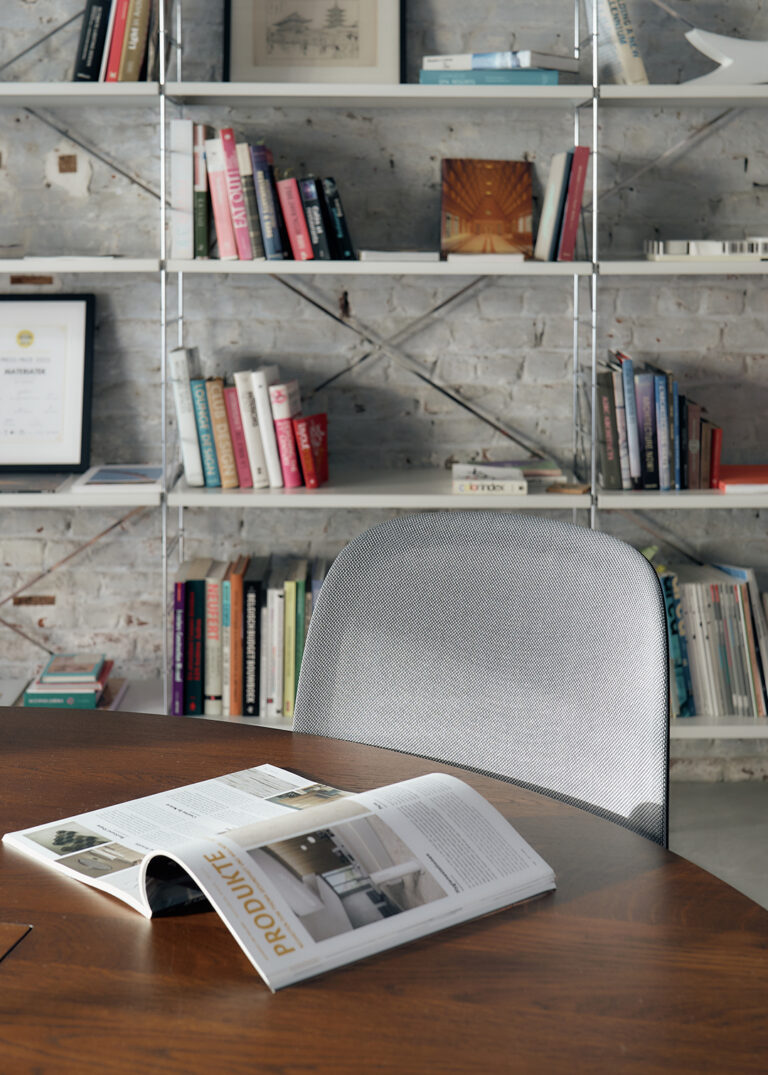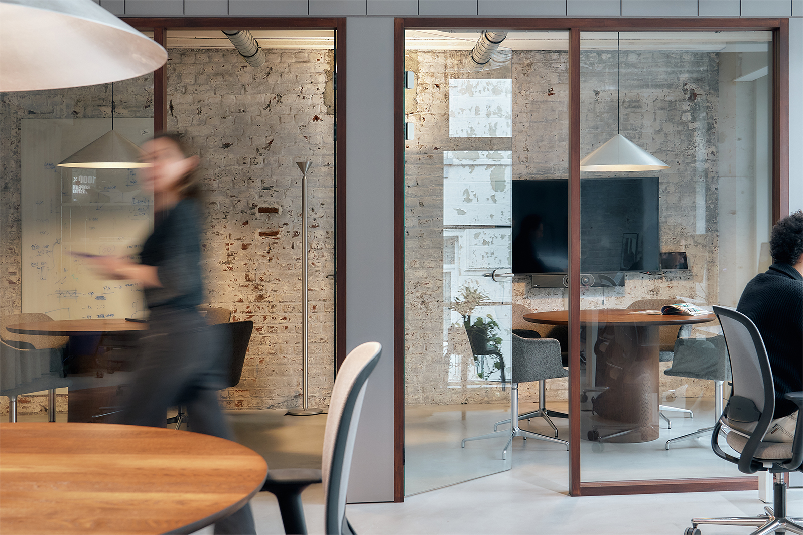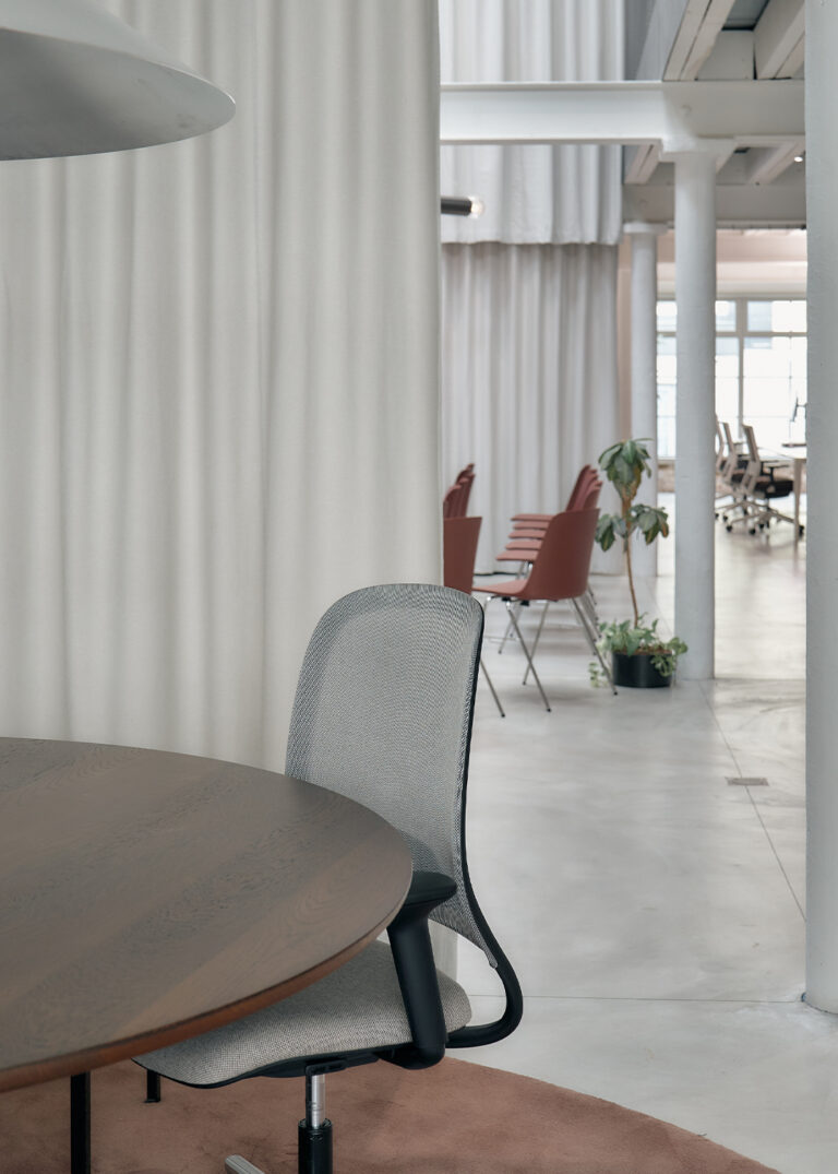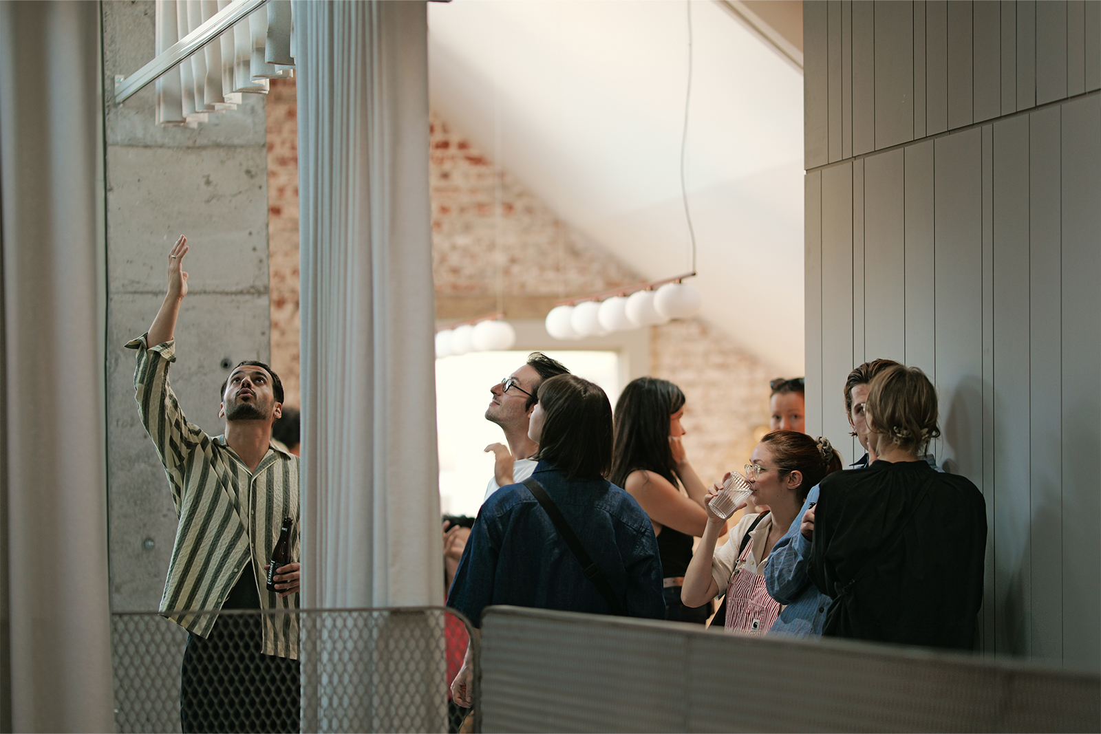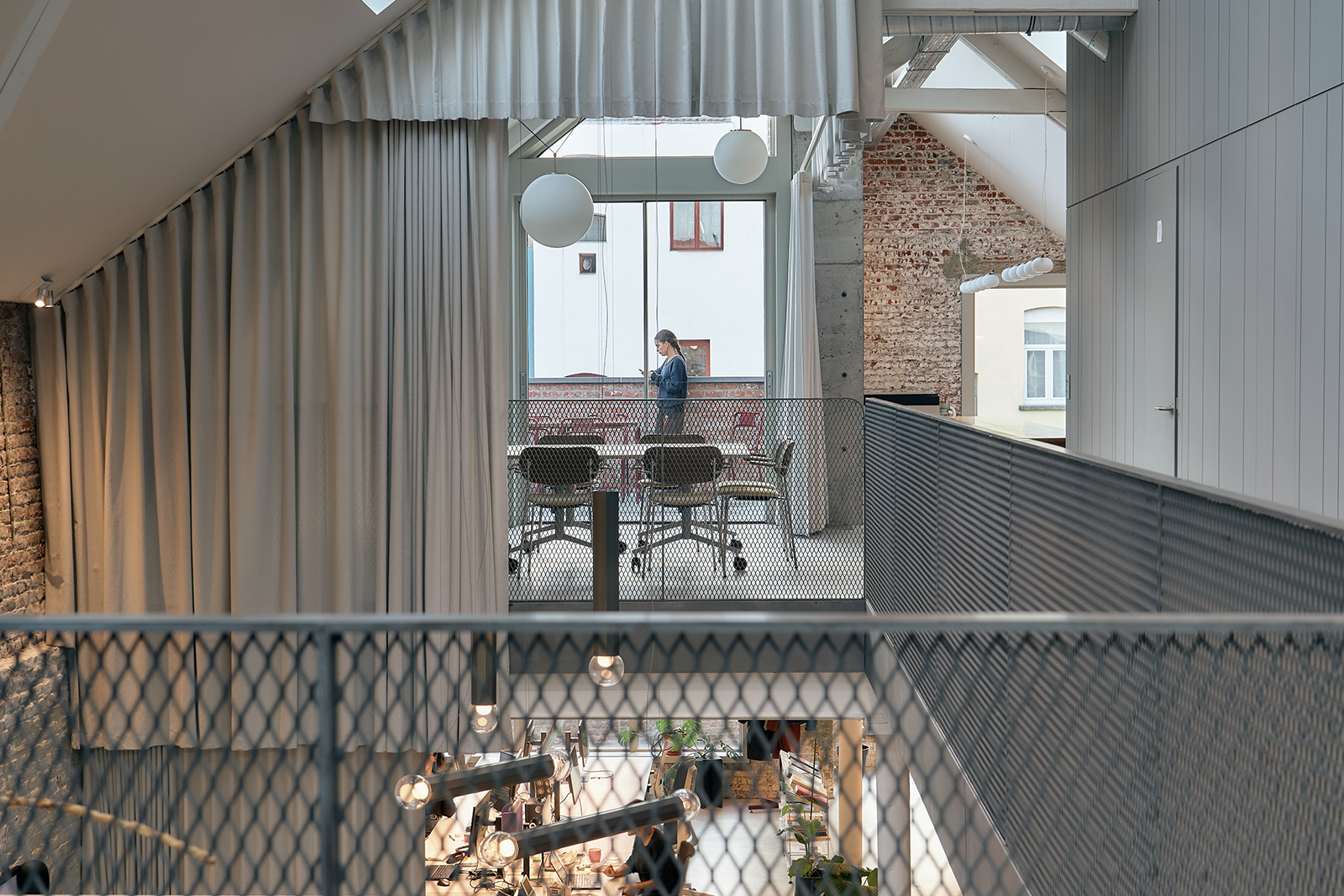 Across the building, each pair of floors takes on a distinct role. The ground and first levels host a material library and coworking area, where full-height galvanised steel shelving lines the raw brick walls, paired with long communal tables for collaboration and material checks, as well as fully equipped meeting rooms and individual booths. Above, the second and third floors revolve around the double-height “Set” a polyvalent central space that organises circulation and various workspace typologies, shifting easily from an informal daily lounge to configurations that support lectures, workshops or events. At the top, a generous kitchen opens onto a new terrace, complemented by flexible workspaces and support areas.