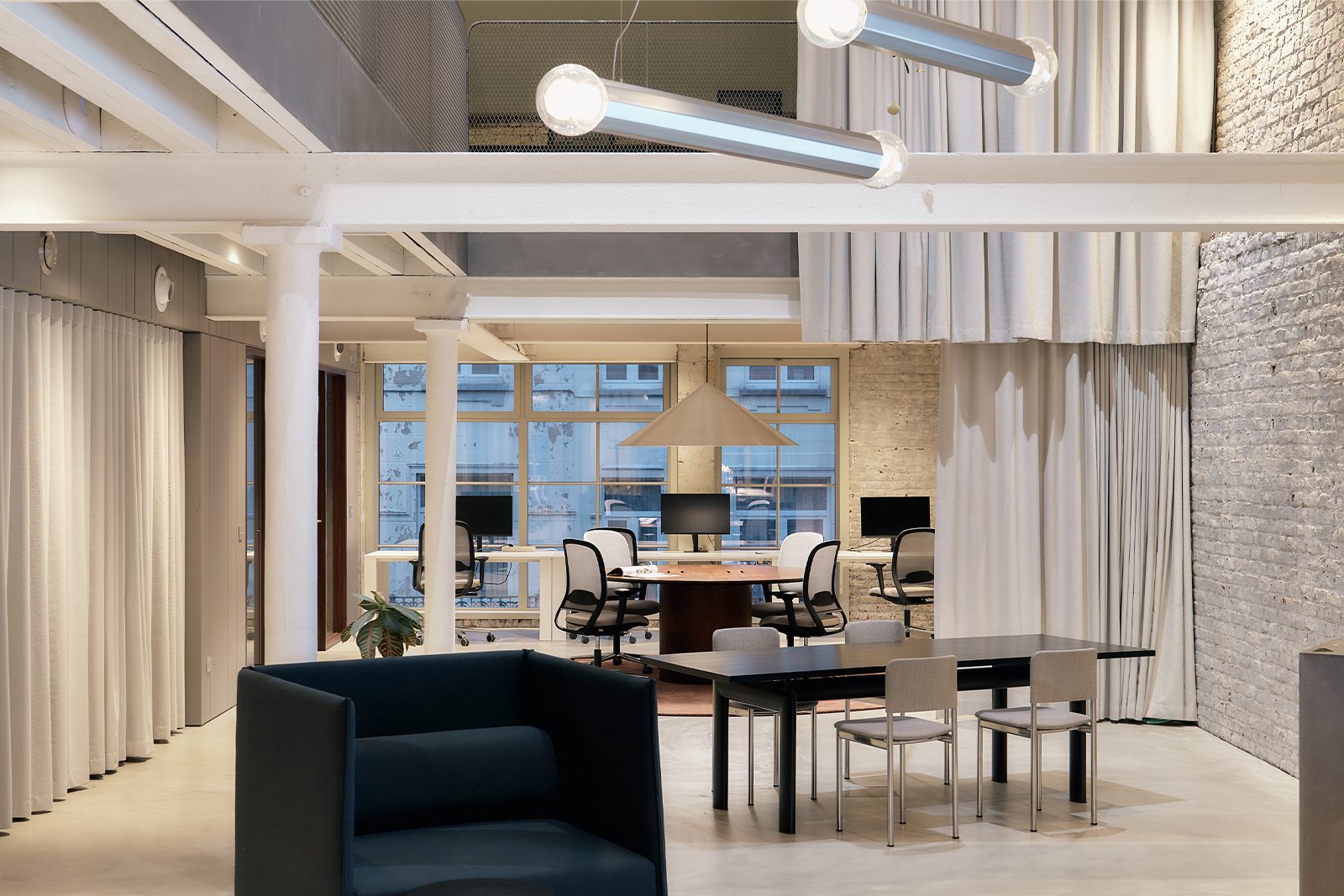 From the outset, the design aimed to reveal and highlihgt the building’s defining features: raw brick walls, metal beams and columns, vaulted ceilings and large openings on both façades. The restoration reinforces the industrial aesthetic with coherent functional elements such as heated concrete floors, raw metal shelving rising through double heights, and extensive curtains used not only for spatial flexibility but also for their acoustic performance and scenographic presence.