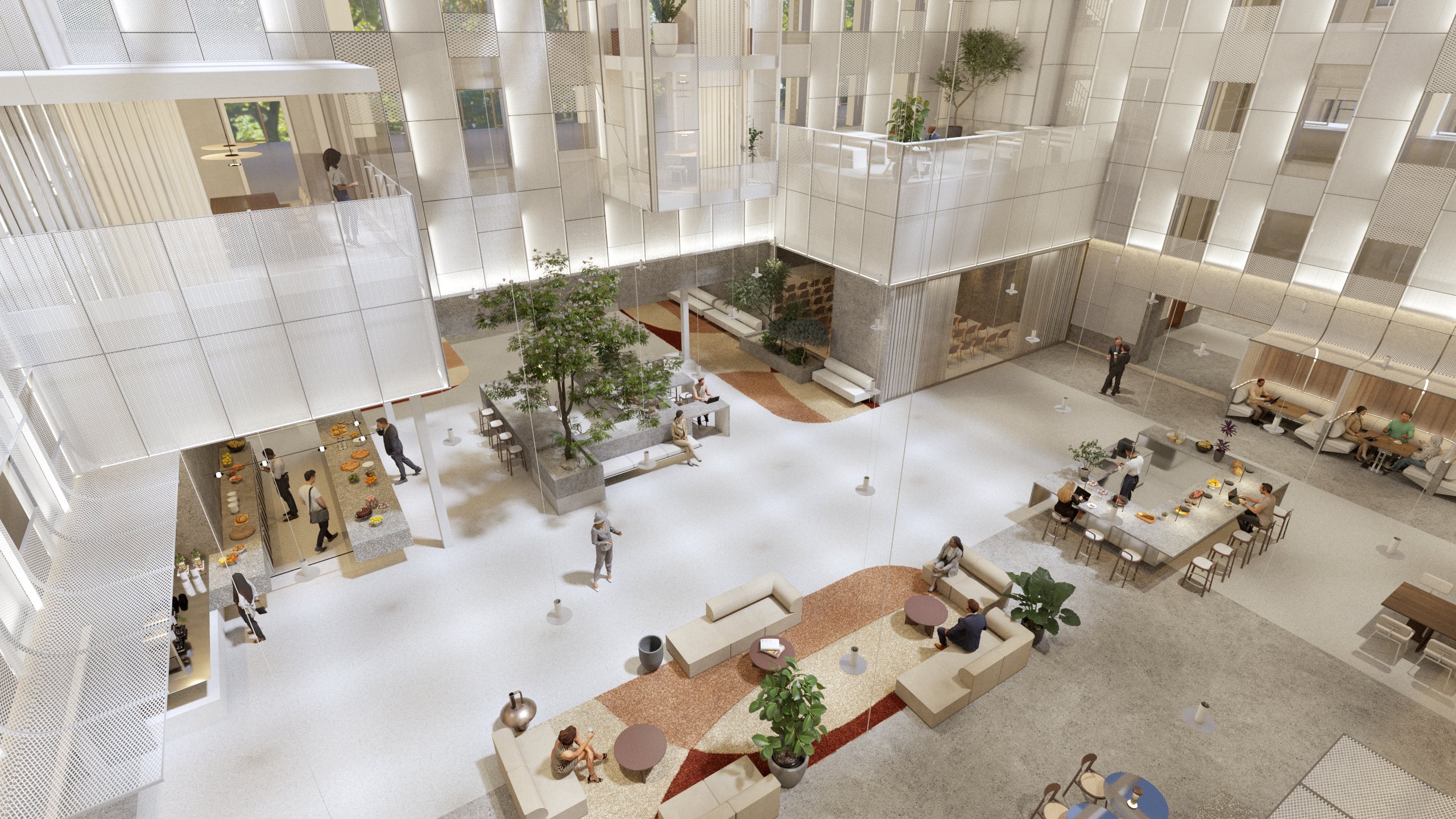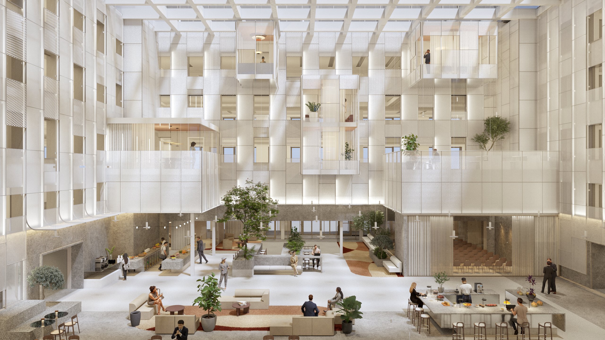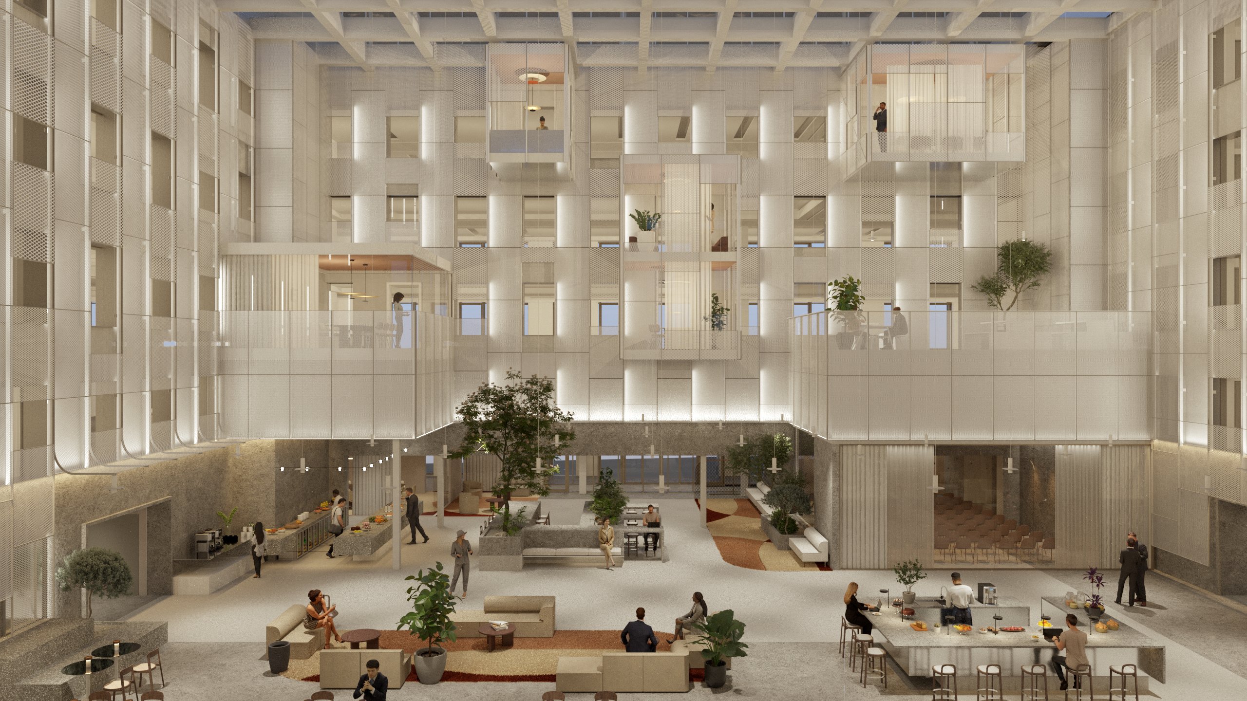 Suspended meeting rooms are introduced within the volume, activating the vertical dimension and bringing life to the interior façades as well as function.