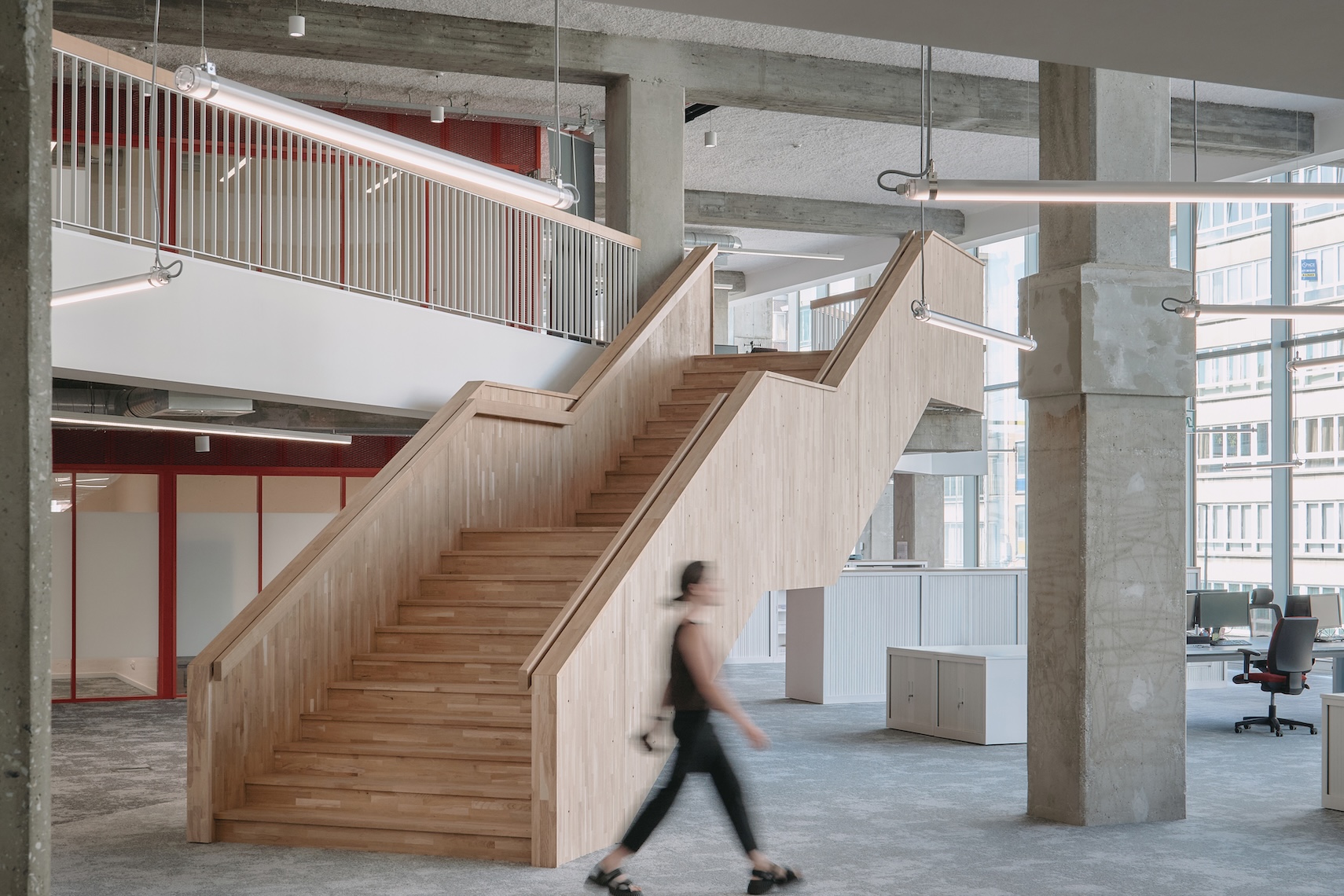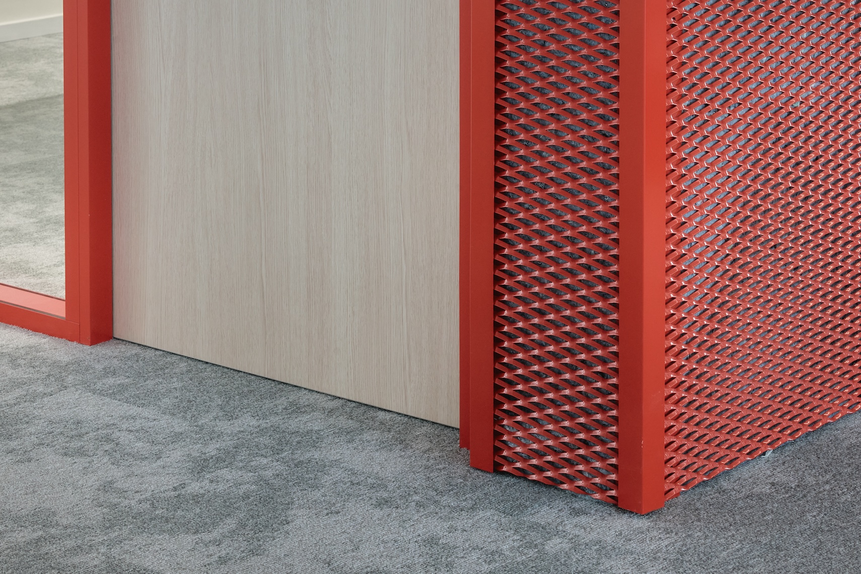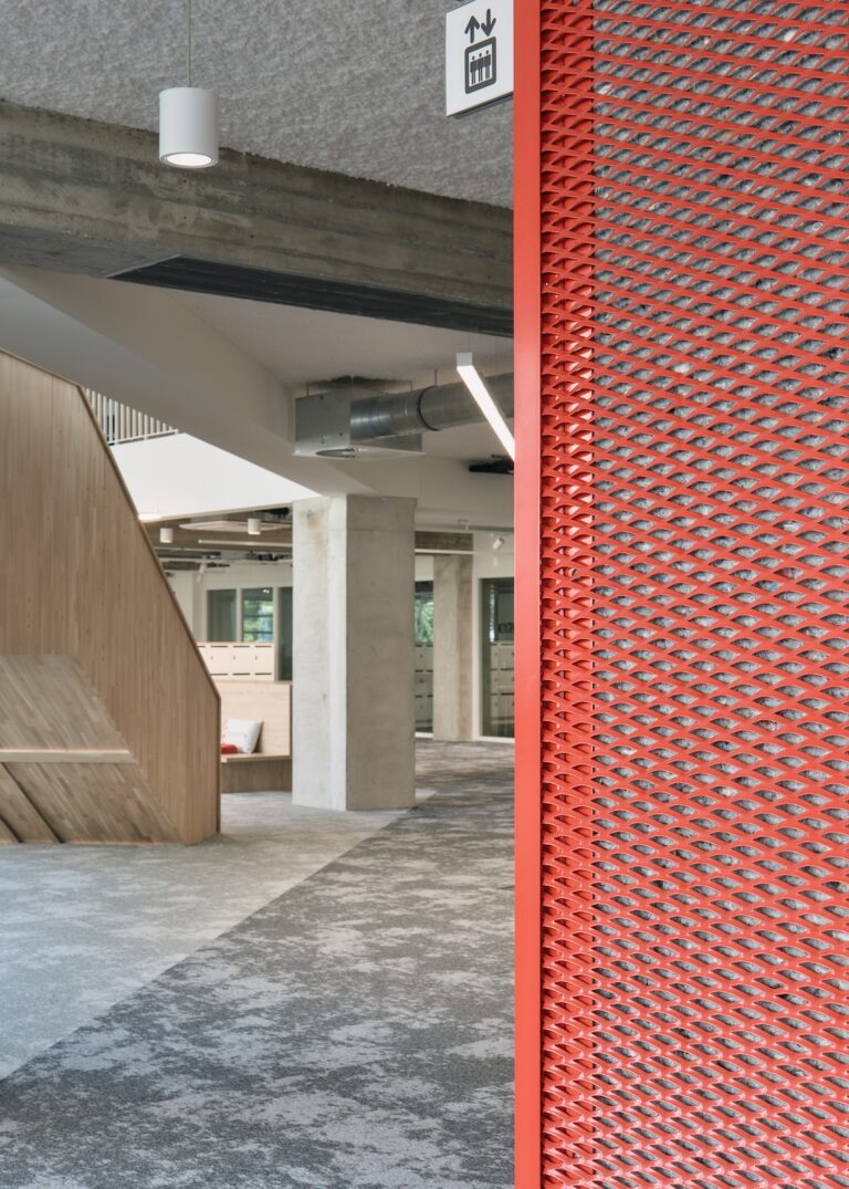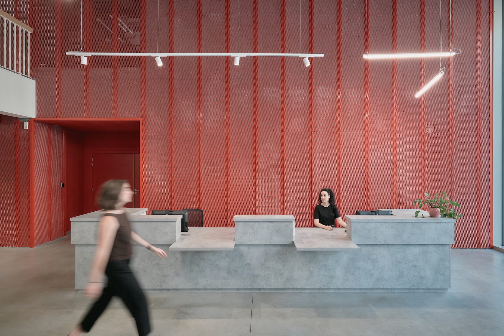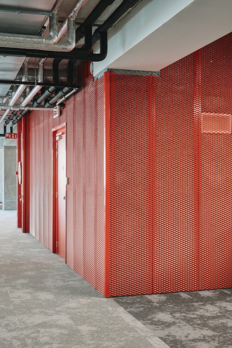 The Solidaris logo served as inspiration, simplified into a woven pattern that represents solidarity and mutual support. This concept comes to life at the core of the building, connecting all floors around a distinctive red metallic mesh layered over acoustic textile.