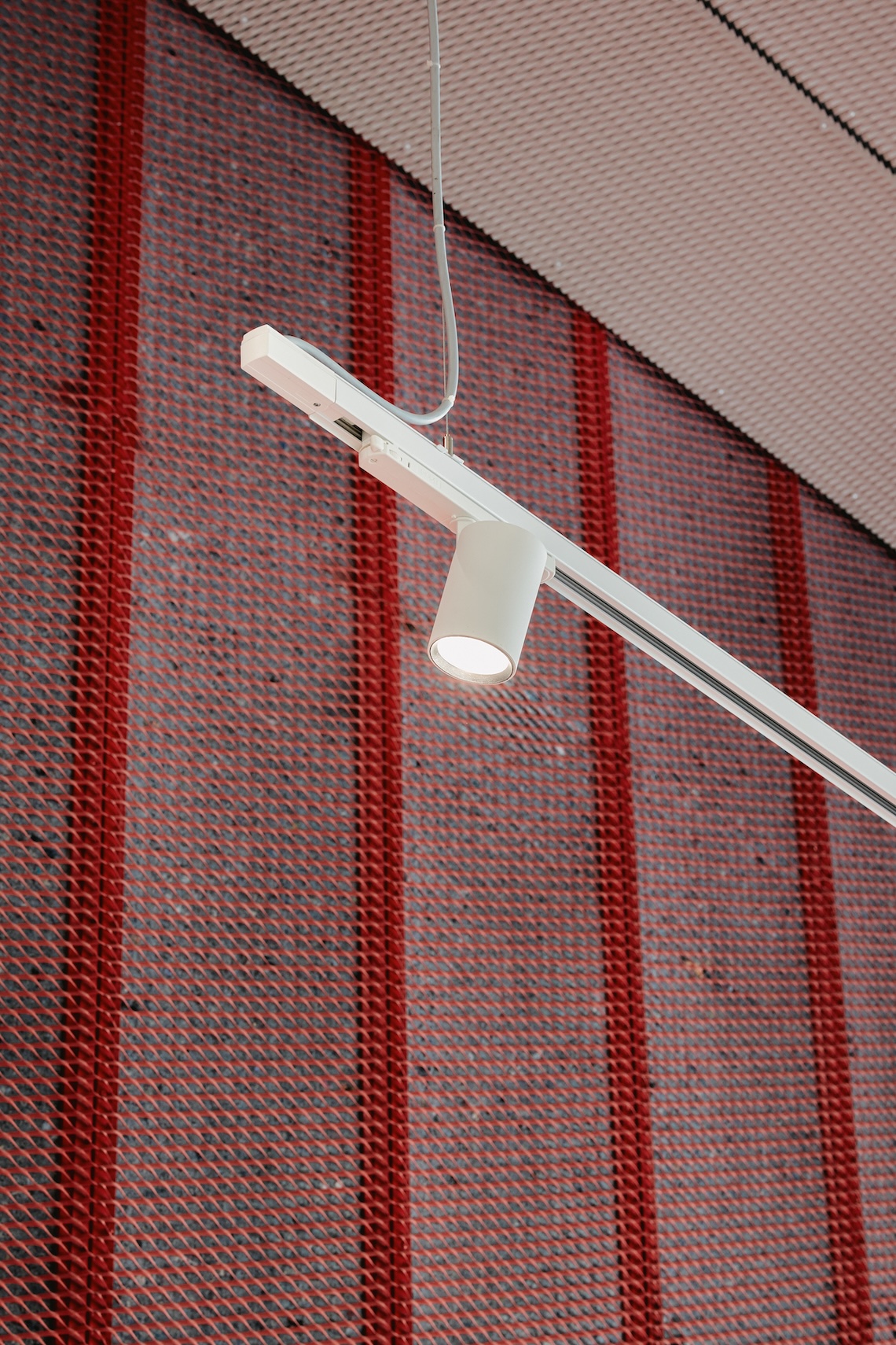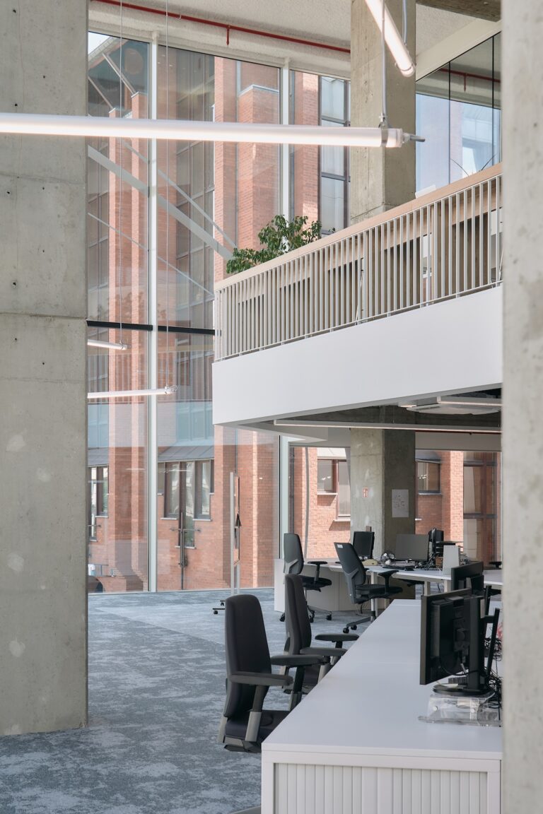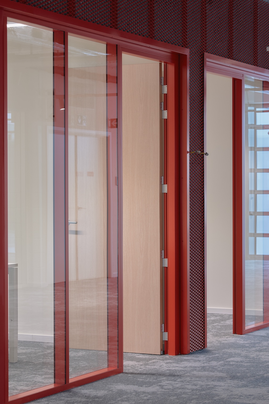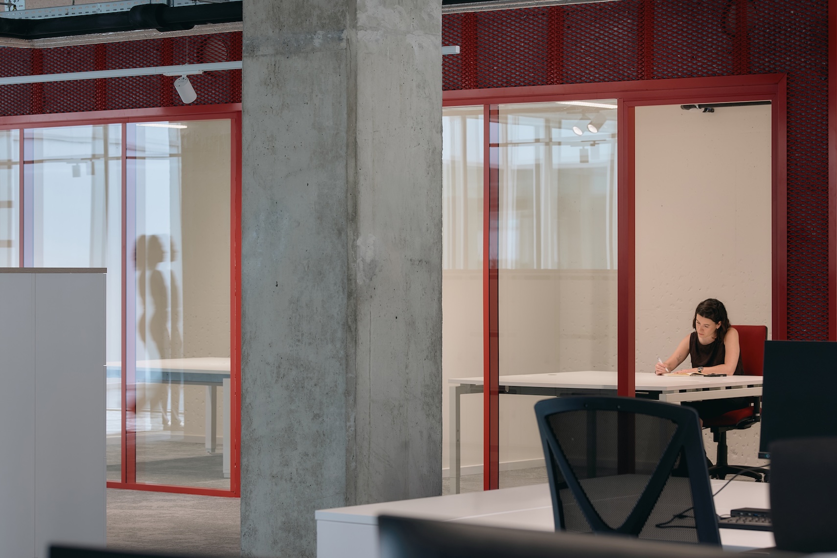 The Solidaris logo served as inspiration, simplified into a woven pattern that represents solidarity and mutual support. This concept comes to life at the core of the building, connecting all floors around a distinctive red metallic mesh layered over acoustic textile.