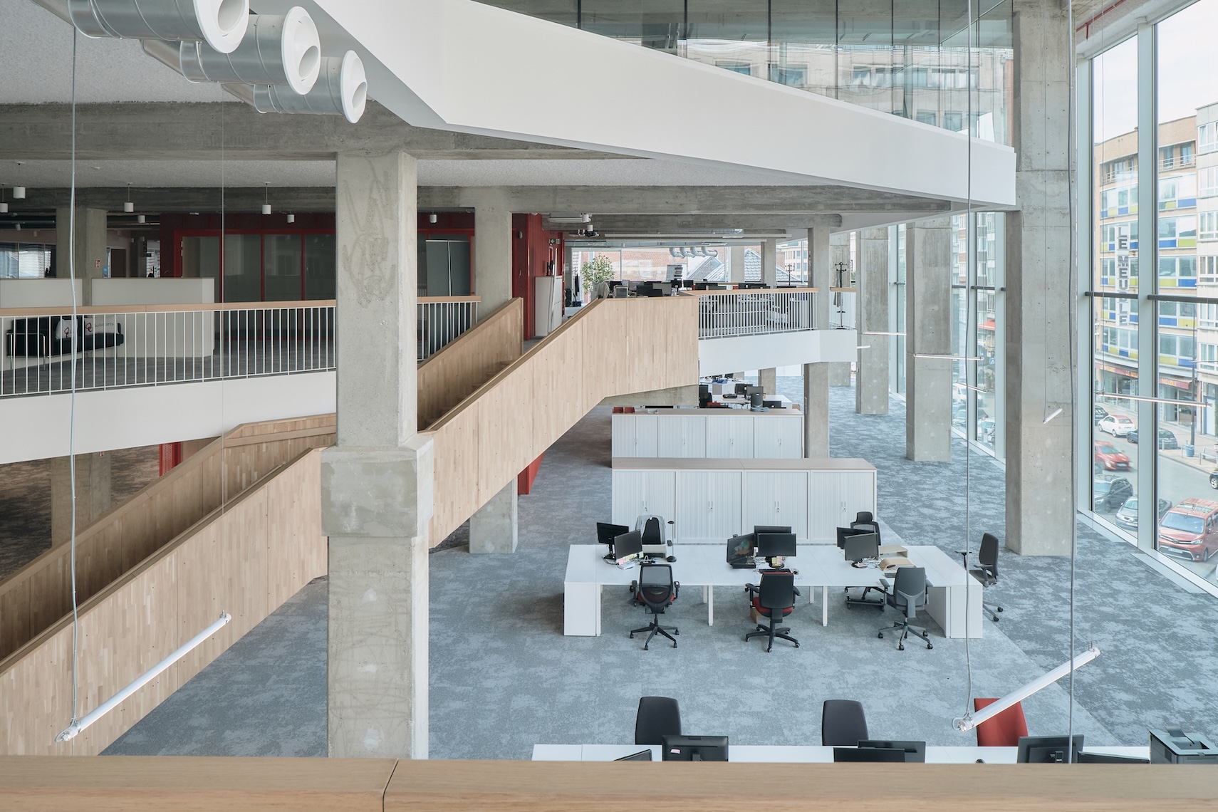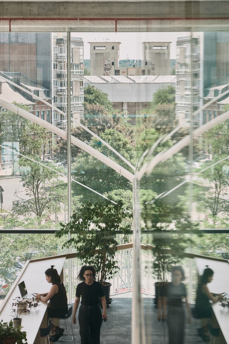 The building in question was a landmark in the city of Charleroi, built in 1971, it had served as a hotel and as headquarters of BNP until 2016. The construction features some innovative techniques that help reduce the structural elements and help generate impressive spaces on double or triple height, maximizing the influx of natural light.