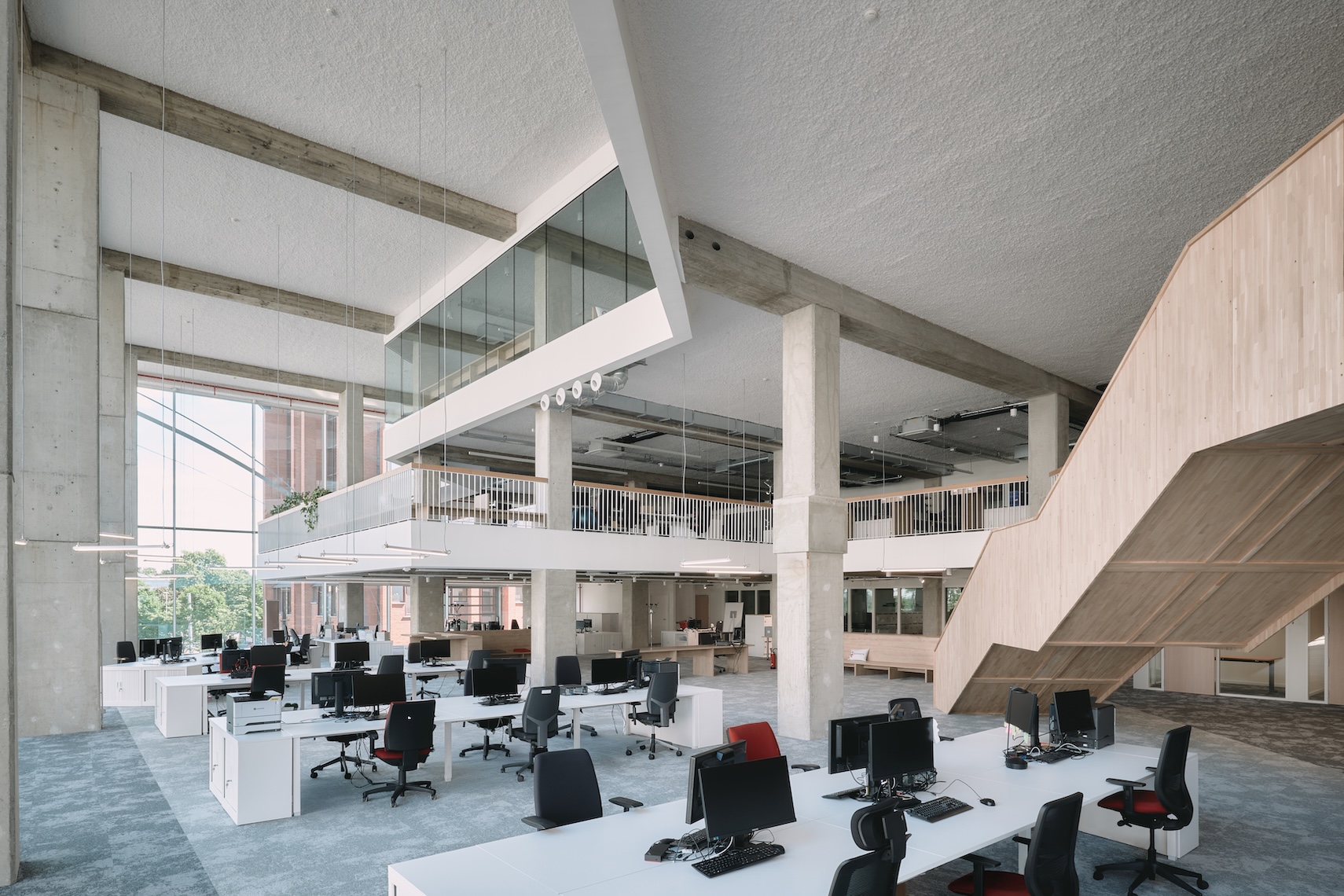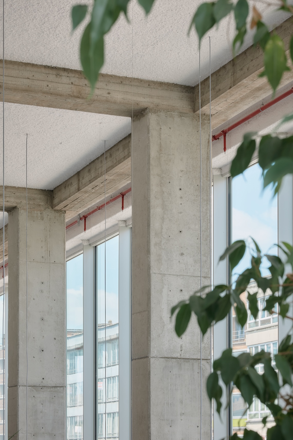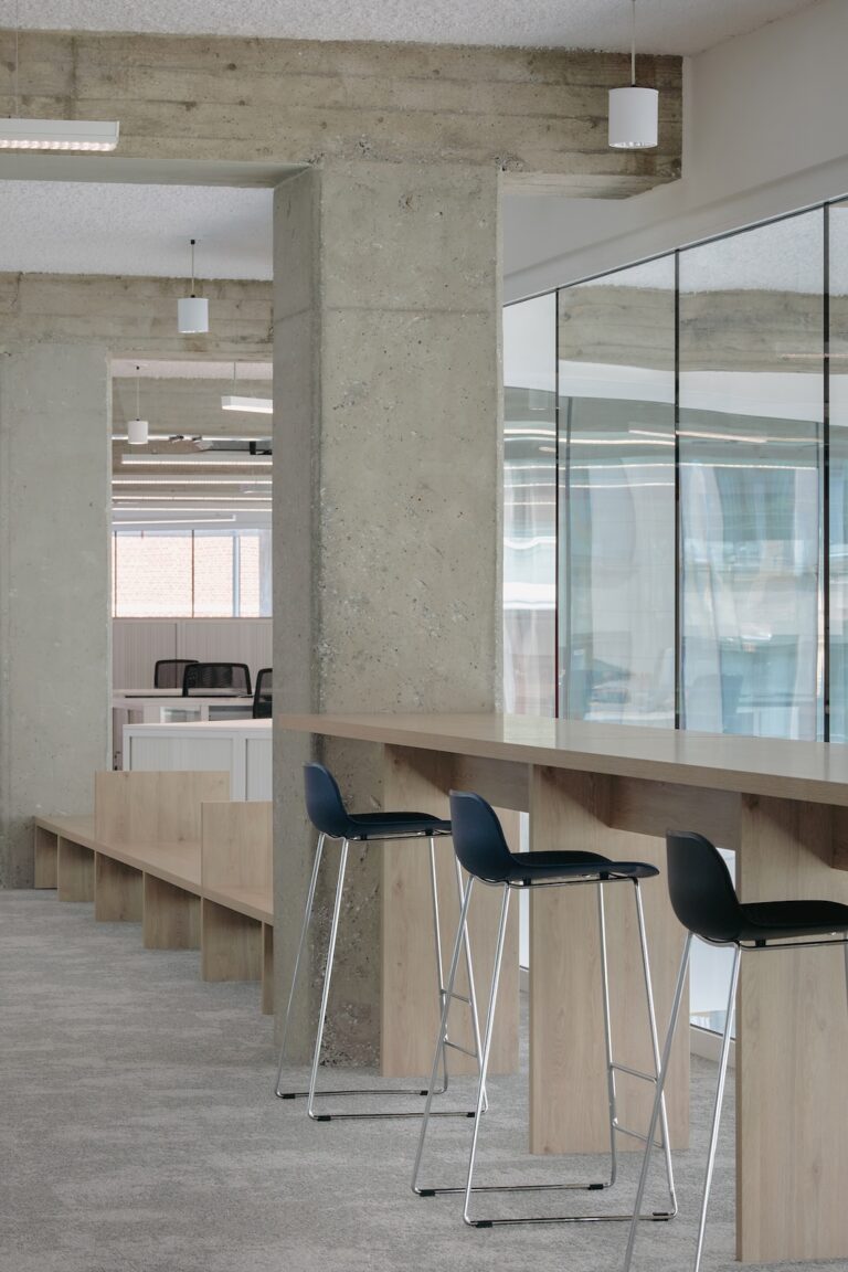 The overall material palette highlights the building’s raw, expressive structure while balancing it with warmth and comfort. Concrete, wood, and glass are paired with natural light to temper industrial simplicity with softer tones, enriched by accents of color that add vibrancy and character.