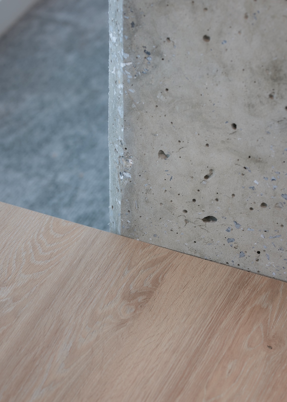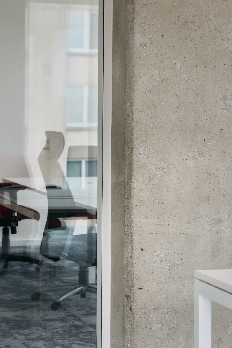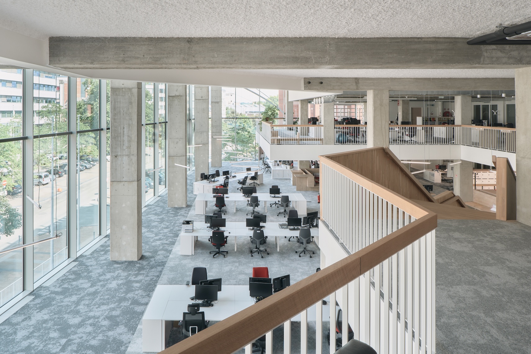 The overall material palette highlights the building’s raw, expressive structure while balancing it with warmth and comfort. Concrete, wood, and glass are paired with natural light to temper industrial simplicity with softer tones, enriched by accents of color that add vibrancy and character.