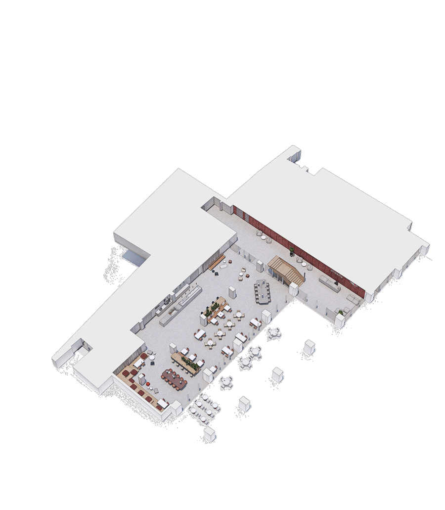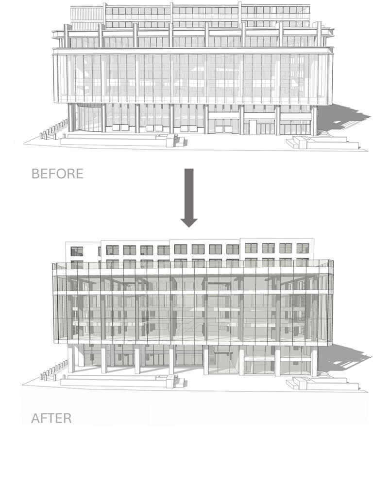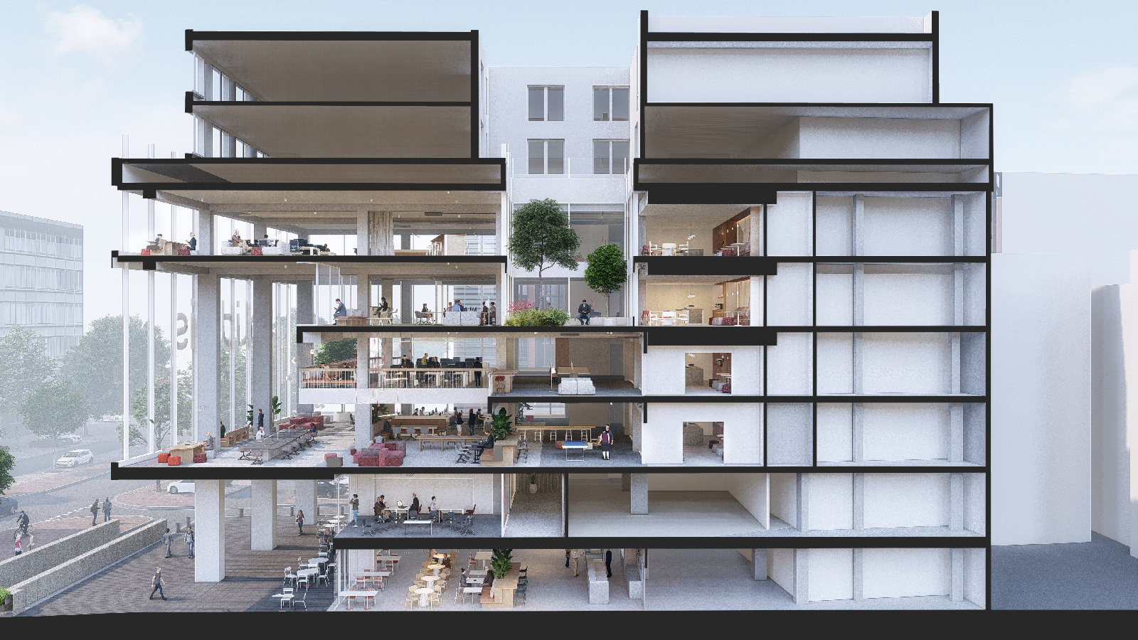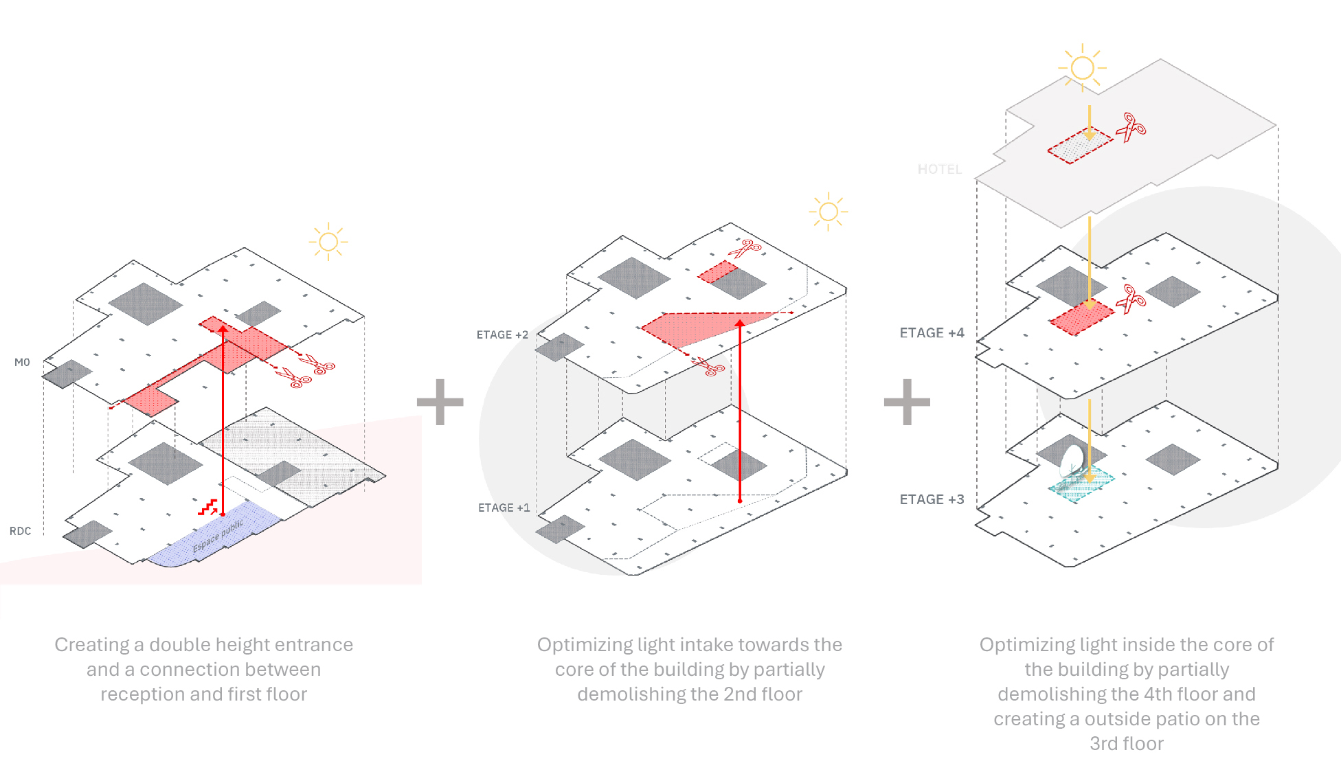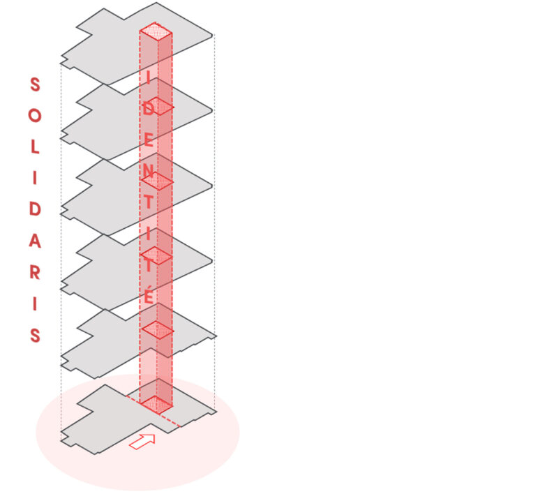 The creation of semi-open duplex spaces echoes the singular character of the existing building, enhancing its authenticity. Ultimately, the transformation envisions a transparent architecture in dialogue with its surroundings, one that naturally embodies and communicates the renewed identity of Solidaris.